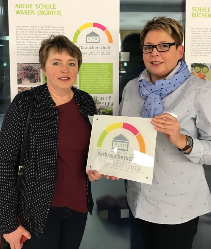 Das hat es in Mecklenburg-Vorpommern noch nicht gegeben: Erstmalig erhält mit der „Arche-Schule“ in Waren eine Bildungseinrichtung in Mecklenburg-Vorpommern die Auszeichnung „Verbraucherschule Silber“. Schulleiterin Manuela Bielke und Beiratsvorsitzende Kathrin Frank haben die Auszeichnung gestern Nachmittag in Potsdam entgegen genommen. Deutschlandweit sind lediglich 27 Schulen mit „Silber“ und fünf mit „Gold“ geehrt worden.
