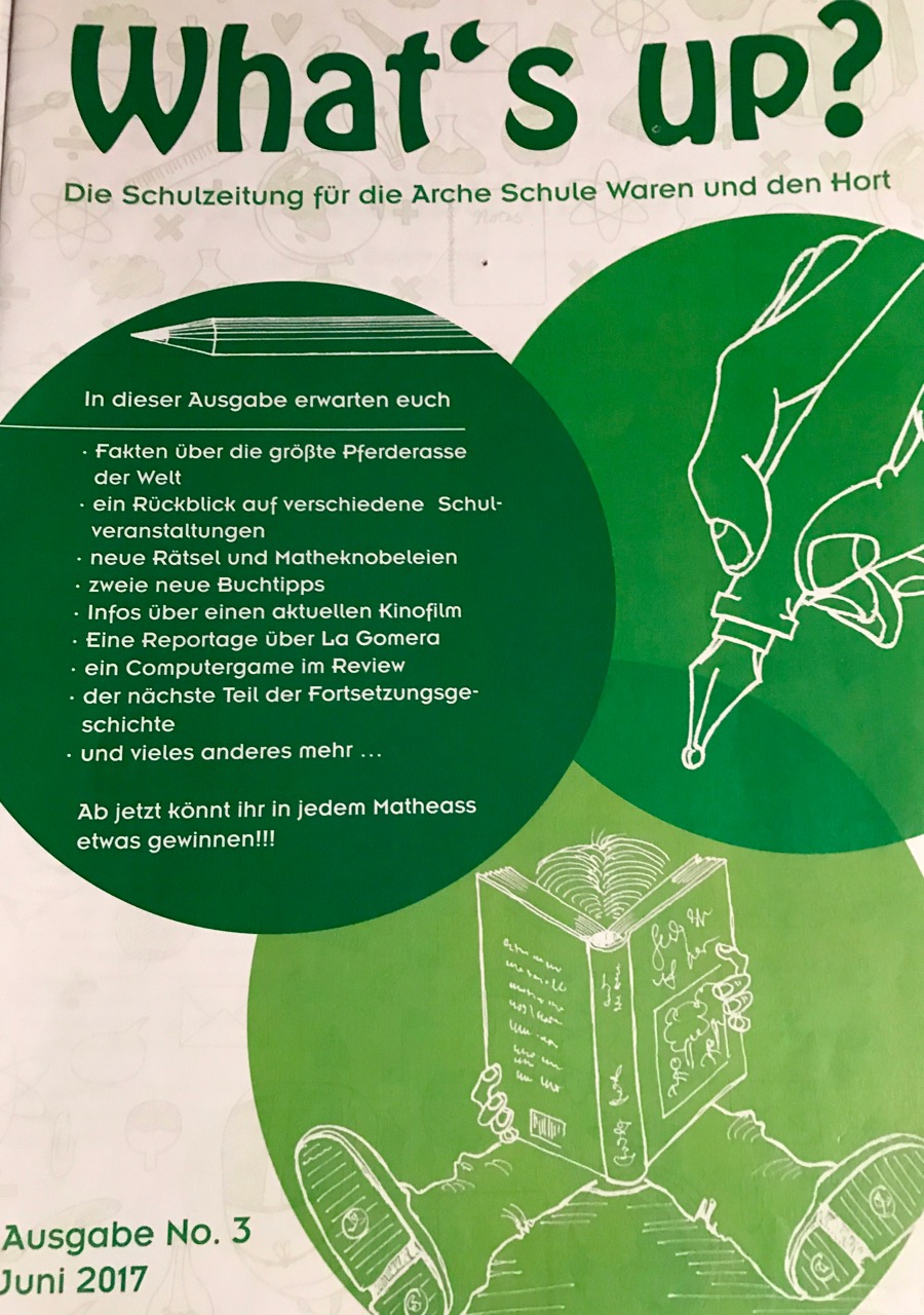 „What’s up?“ – so heißt etwa die Schülerzeitung der Arche-Schule in Waren. Sie ist nur eines der Projekte im Bereich der Verbraucherbildung, in dem sich die Schüler engagieren können. Seit dem Schuljahr 2016/2017 veröffentlicht ein Redaktionsteam aus Fünft- und Sechstklässlern in der Schülerzeitung regelmäßig Interviews, Berichte aus der Schule sowie Artikel über aktuelle politische Themen. Sie lernen dabei das selbstständige Recherchieren und Schreiben, bekommen einen Einblick in die Produktionsprozesse einer Zeitung und hinterfragen Themen aus ihrer eigenen Lebenswelt. „Was passiert in der Welt?“ „Welchen Nachrichten kann ich vertrauen?“ – das sind Fragen, die sich schon Kinder stellen.