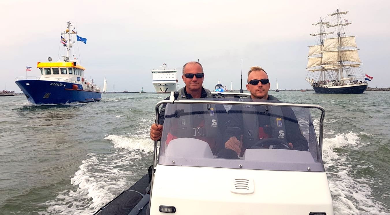 Zum Team der mehr als 300 Polizisten, die die 28. Hanse-Sail am Wochenende zu Land und zu Wasser abgesichert haben, zählten auch die beiden Warener Wasserschutzpolizisten Polizeihauptmeister Frank Goetz (links) und Polizeiobermeister Daniel Klitsche.