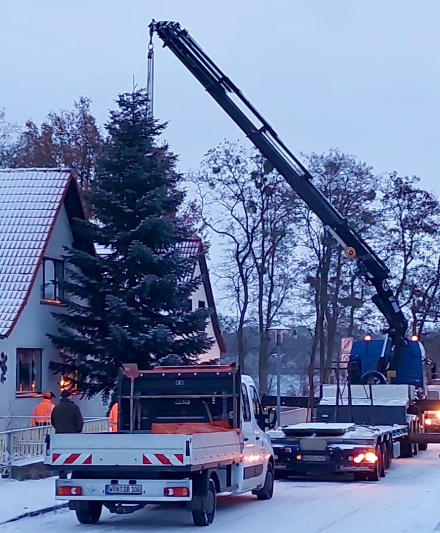 Dieser Baum, gewachsen viele Jahre am Bungenberg in Waren, schmückt in wenigen Minuten den Alten Markt in Waren.