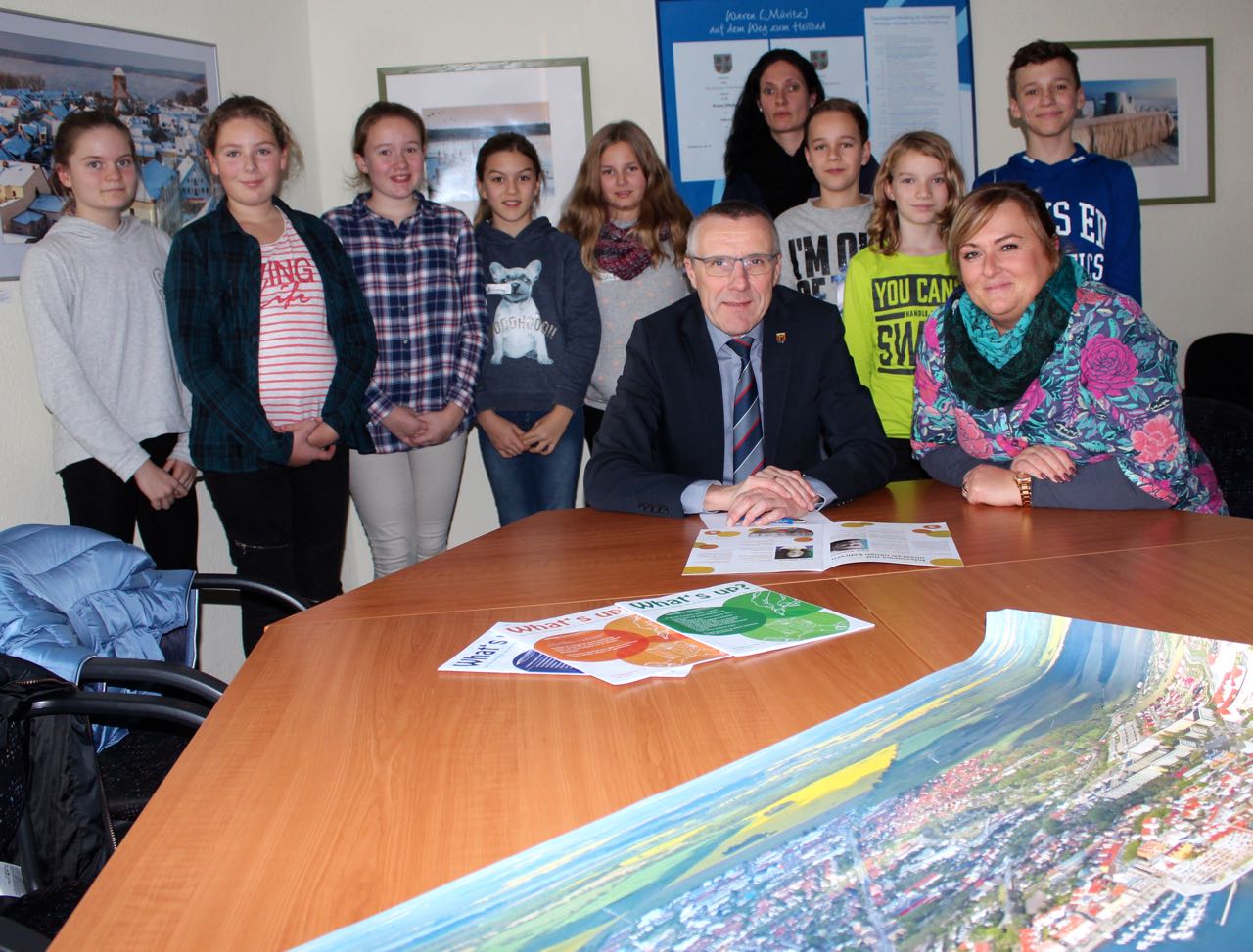 Foto unten: Warens Bürgermeister Norbert Möller, seine Sprecherin Steffi Schabbel und die knallharte Schülerzeitungsredaktion der Arche-Schule inklusive Betreuerin Madlen Leetz.
