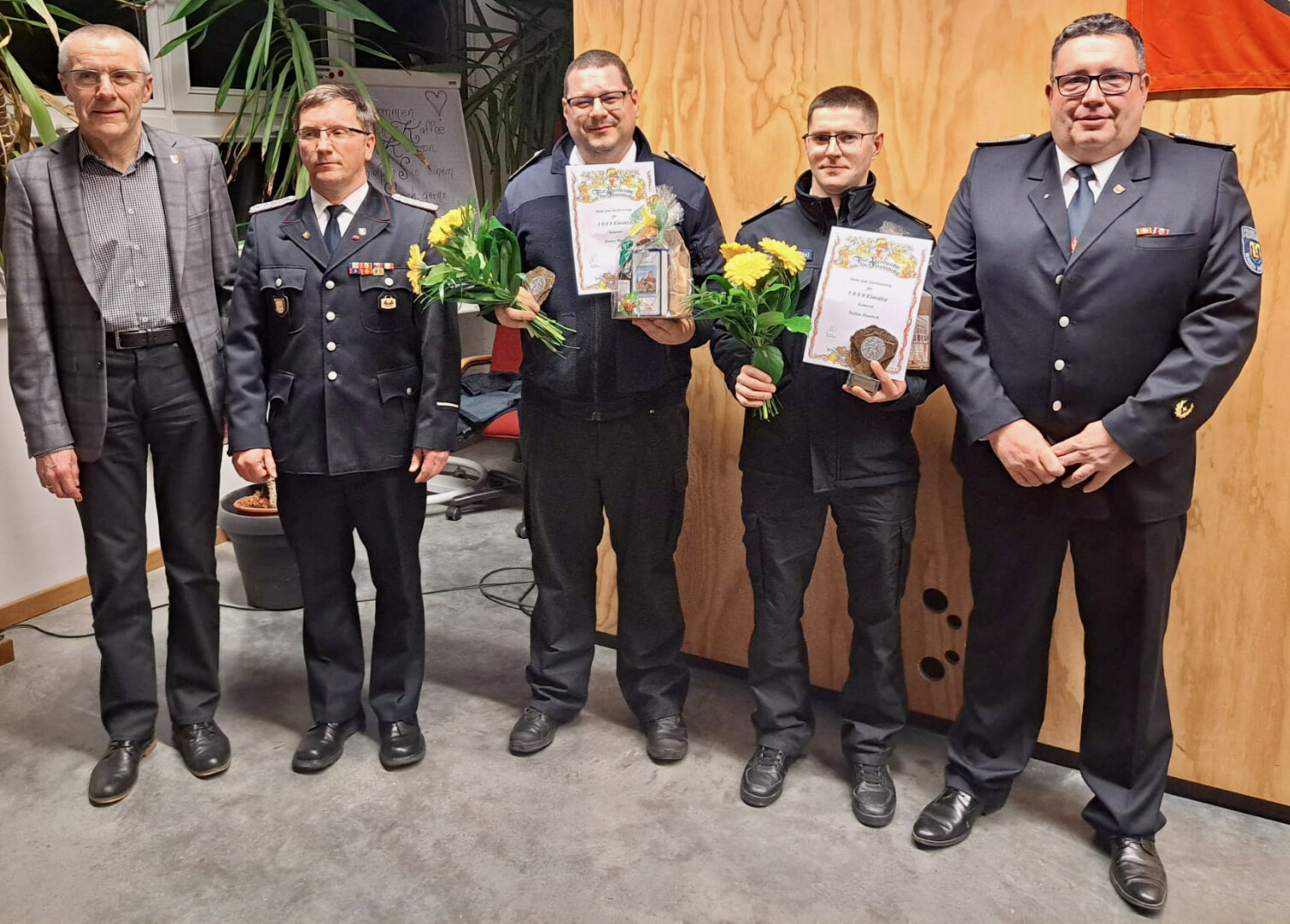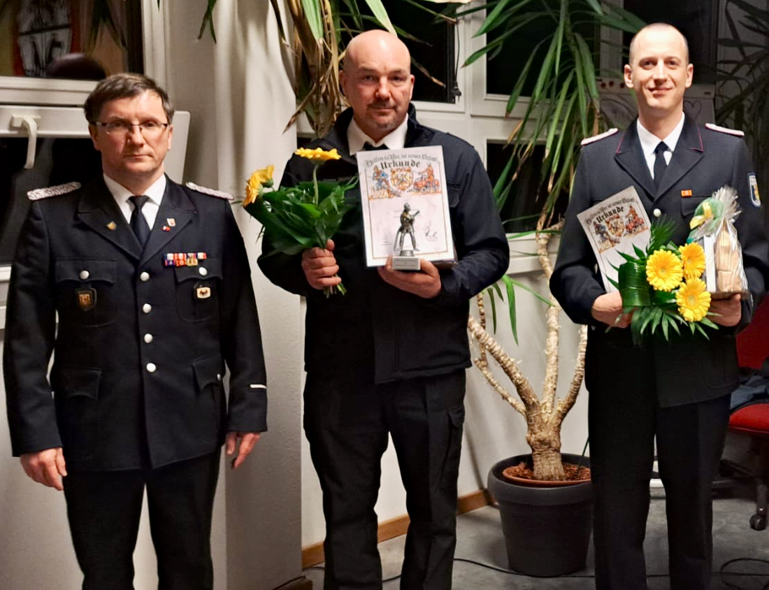 Für insgesamt 2000 Einsätze ehrten der Wehrführer und Bürgermeister Norbert Möller den Kameraden Andreas Kocik, für 1000 Einsätze wurden Stefan Hanisch und Denny Rosen ausgezeichnet.