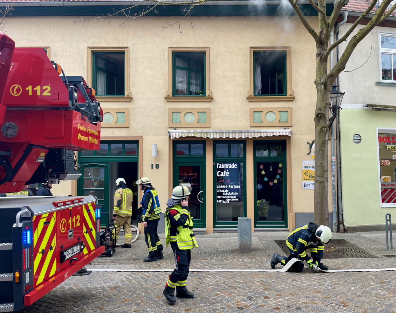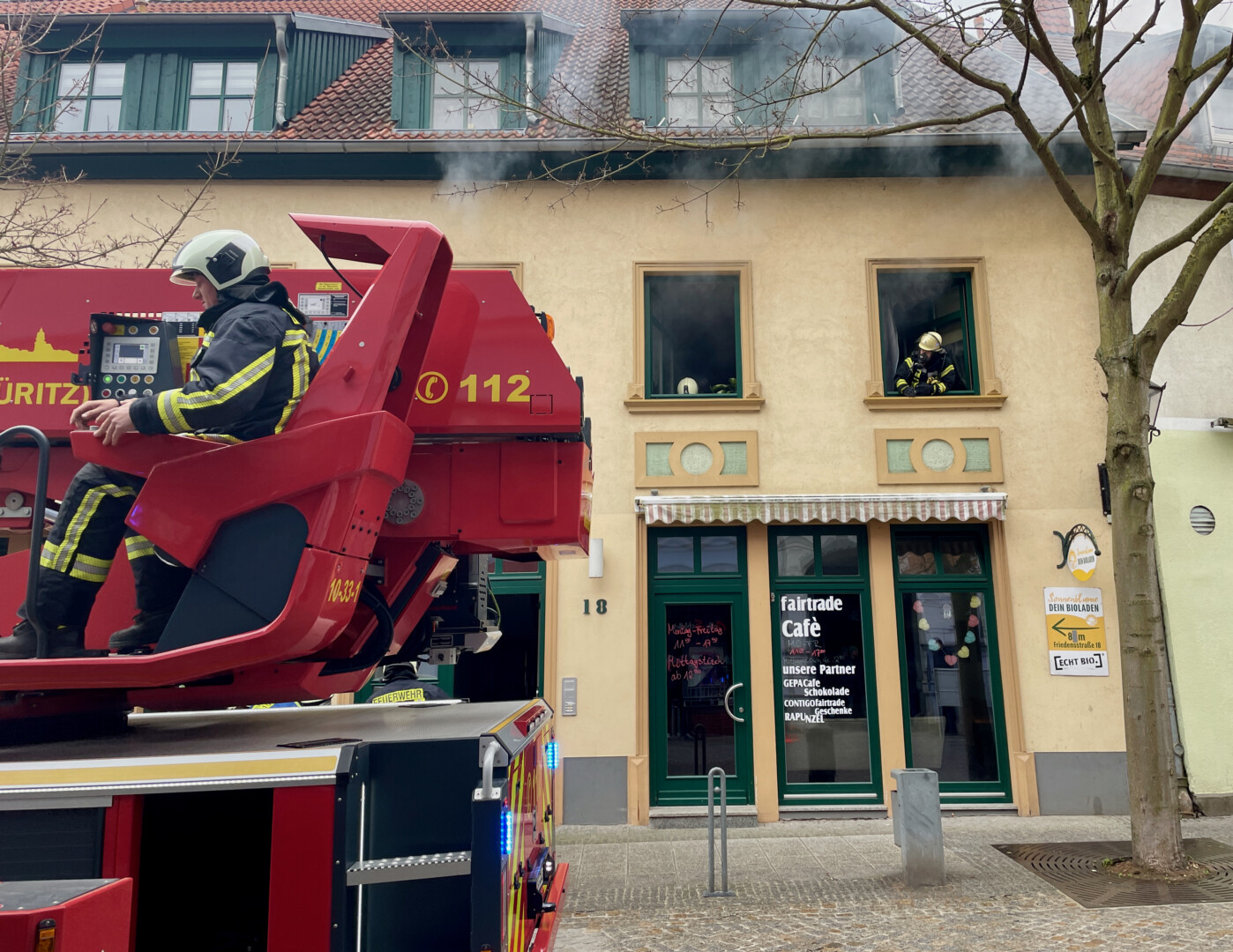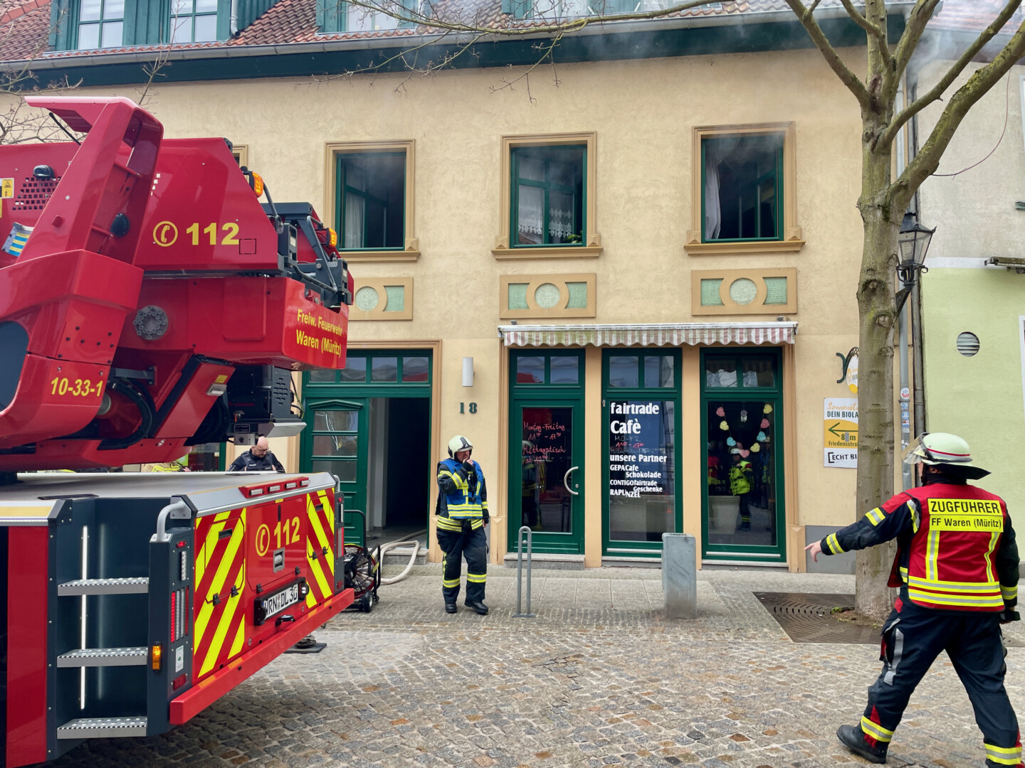 Schreck heute Mittag in der Warener Altstadt: In einer Wohnung über dem Fair-Trade-Café in der Friedensstraße schrillte eine Rauchmelder, Qualm drang aus den Fenstern. Ersten Informationen zufolge brannte es in der Küche der Wohnung.