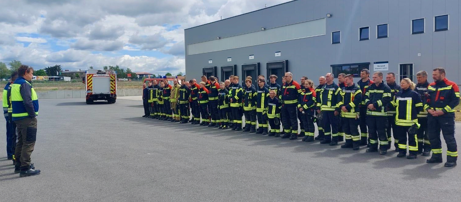 Die Feuerwehr um Wehrführer Reimond Kamrath bedankt sich bei Smurfit Westrock für die Ausbildungsmöglichkeit und den fleißigen Organisatoren der Groß-Übung.