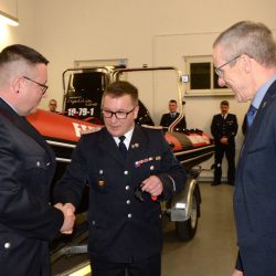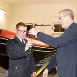 Auch ein Geschenk gab’s zur Jahreshauptversammlung: Ein neues Schlauchboot für fast 25 000 Euro (WsM berichtete gestern). Warens Bürgermeister Norbert Möller durfte nicht nur den Schlüssel übergeben, sondern auch mal am Steuer stehen – allerdings nur auf dem Trockenem.