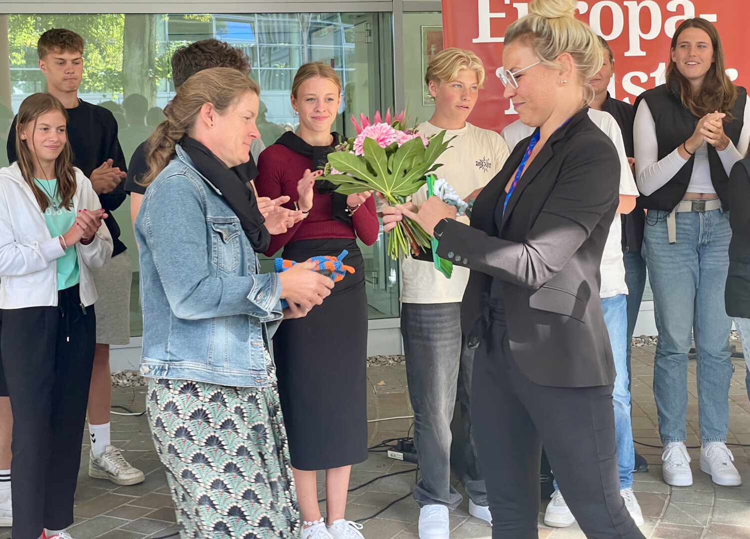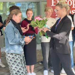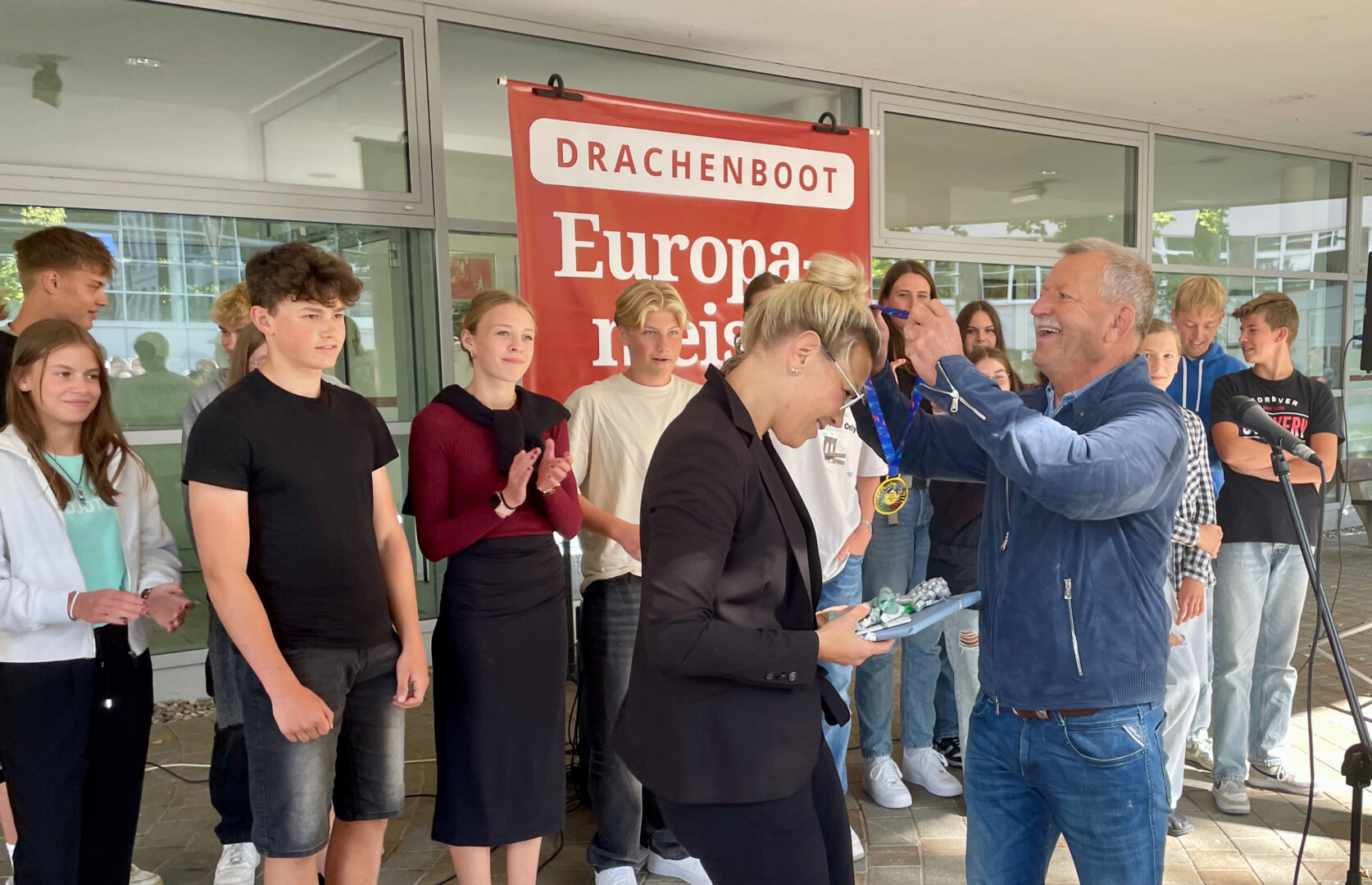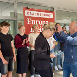 Am Dienstag sind sie von Eltern und Freunden bei ihrer Ankunft aus dem italienischen Ravenna überrascht worden, gestern gab’s für das Drachenboot-Team „Schlagseite“ auf dem Schulhof des Richard-Wossidlo-Gymnasiums noch einmal eine Überraschung. Die erfolgreichen Sportler, die mit vier Europameistertiteln, zwei Vizemeister-Titeln und weiteren guten Platzierungen zurück kehrten (WsM berichtete), wurden von ihren Mitschülern und Lehrern gefeiert. Viele Dankesworte und Blumen gab’s zudem für die beiden Betreuer und Trainer Ines Spieß-Falge und Ingo Warnke. Und natürlich erhielten die Schüler auch eine kleine Aufmerksamkeit.