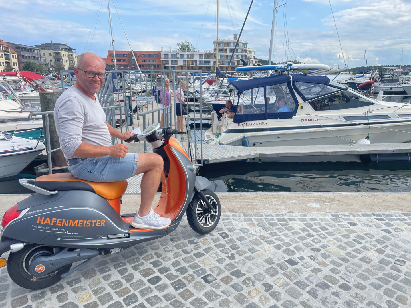 Hochsaison auch am Warener Hafen. Trotz des Herbstwetters. Hafenmeister Jens Ahlrep jedenfalls hat ordentlich zu tun. Und da die Wege am Hafen nicht gerade kurz sind, braucht er einen fahrbaren Untersatz, um schnell von A nach B zu kommen. Und irgendwie hat der Hafenmeister dabei offenbar immer einen Faible fürs Besondere: Wie beispielsweise einst für das niedliche Mini-Hafenboot mit Rundum-Leuchte. Momentan setzt Jens Ahlrep zumindest an Land auf einen schicken Elektro-Motorroller in coolen Farben. Auch der zieht wieder viele Blicke auf sich.