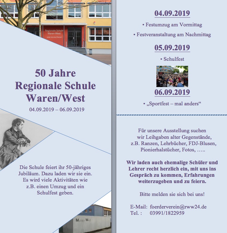 Die Regionale Schule Waren/West – älteren Warenern eher als Engelsschule ein Begriff – feiert im Herbst ihren 50. Geburtstag. Das soll nicht nur ordentlich gefeiert werden. Vielmehr möchten Lehrer und Schüler auch an die Geschichte des Hauses am Engelsplatz erinnern und brauchen dafür die Hilfe der Müritzer.