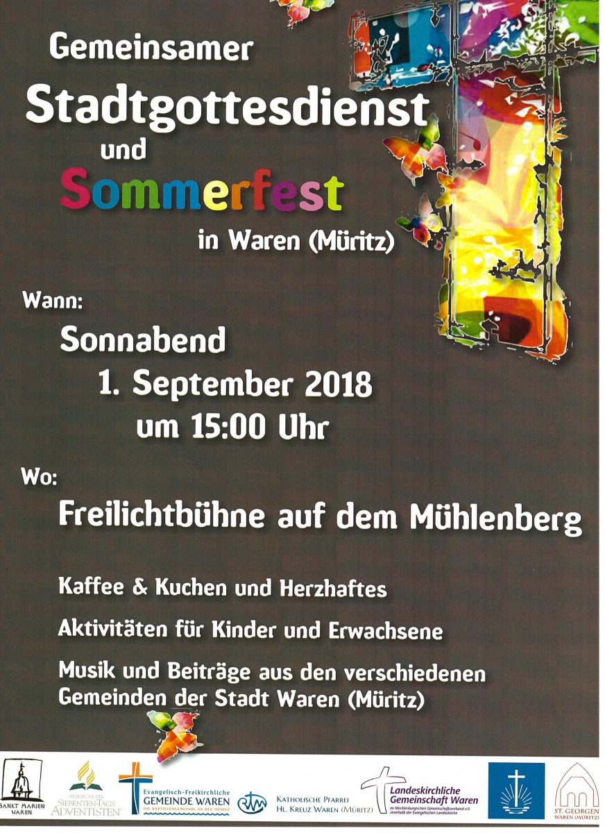 Am morgigen Sonnabend, 1. September, findet auf dem Mühlenberg in Waren das erste gemeinsame Sommerfest von sechs Kirchengemeinden statt. Los geht’s um 15 Uhr mit einem Gottesdienst auf der Freilichtbühne.