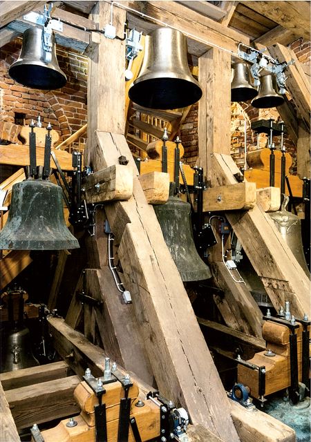 Die Glocken aus Marl haben schon Patina angesetzt, und man sieht deutlich, dass die Glockenspielglocken, im Gegensatz zu den Läuteglocken, Dank kompliziertester elektronischer Technik von außen angeschlagen werden.
