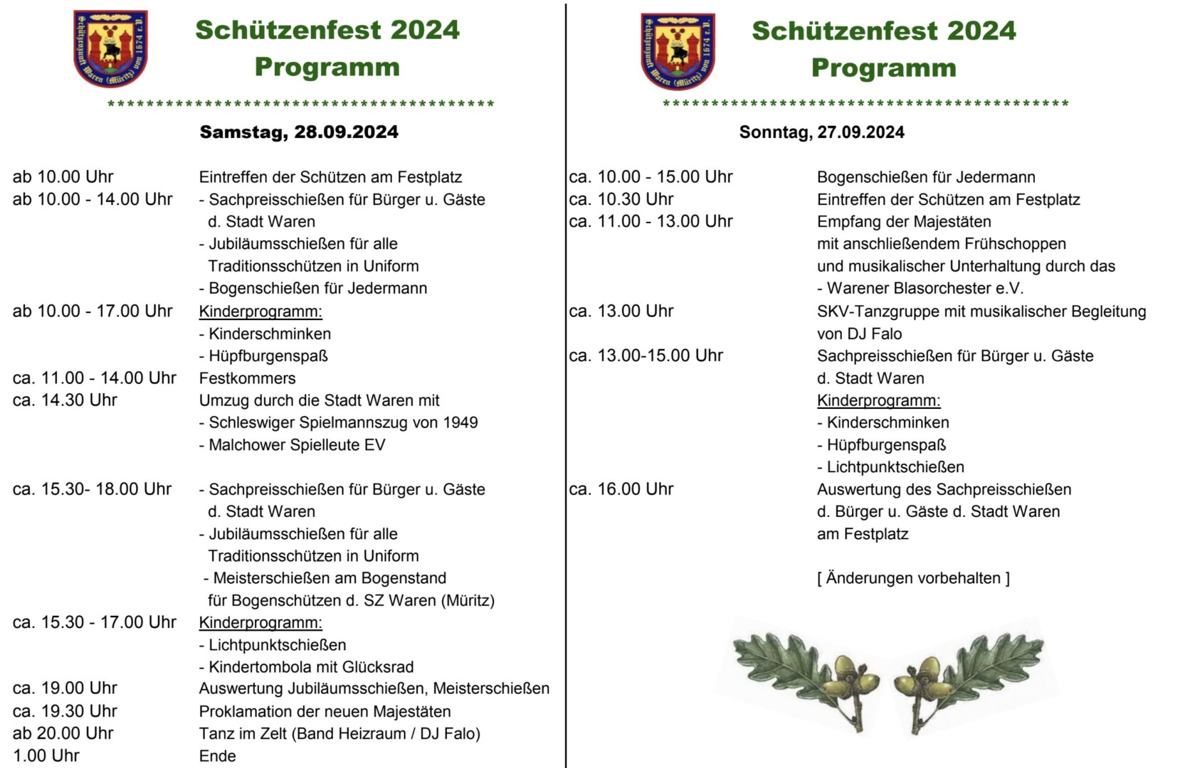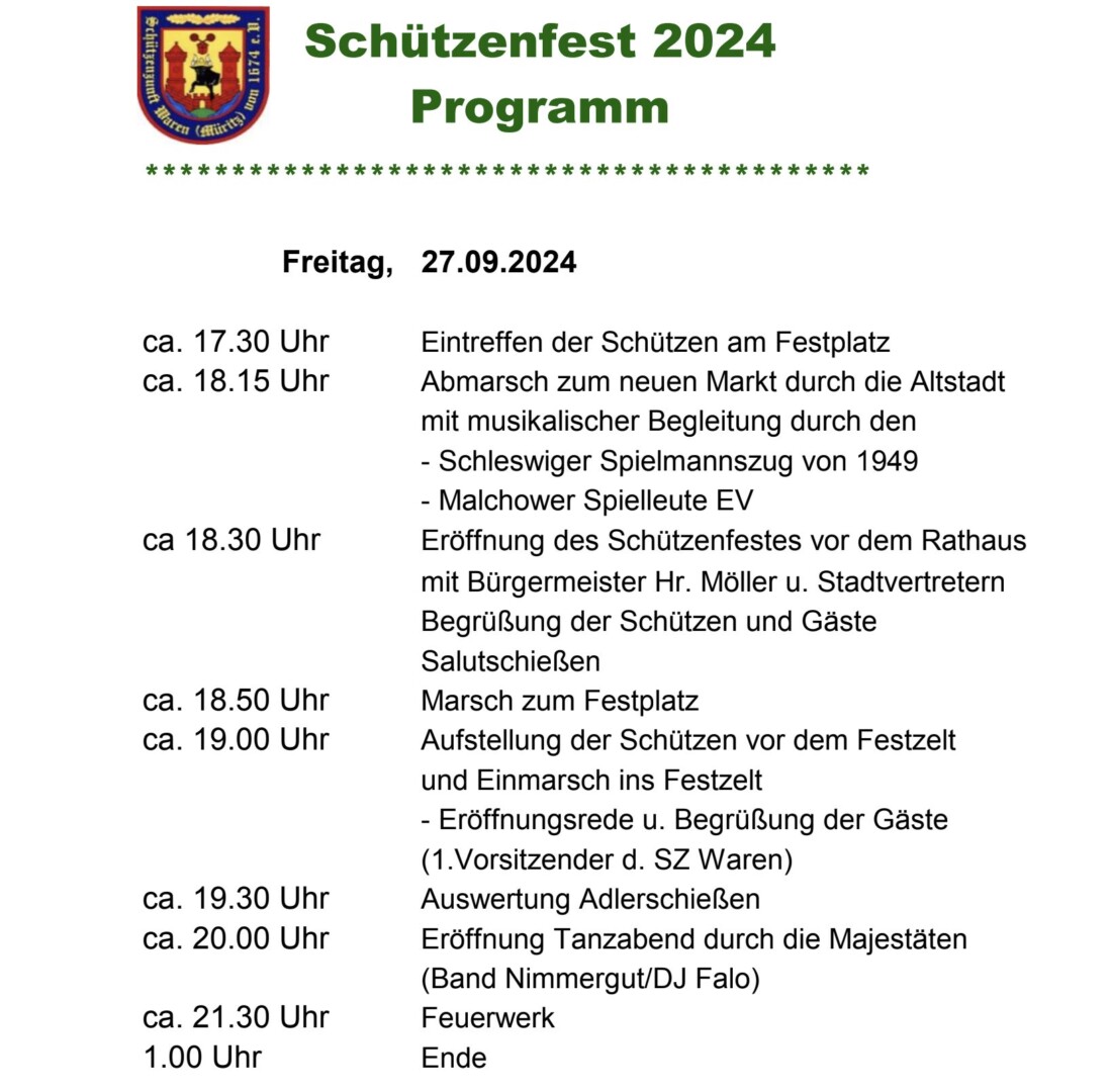 „Unser besonderes Jubiläum möchten wir mit allen Warenern und Gästen mit einem zünftigen Fest feiern. Die Eröffnung findet am Freitag gegen 18.30 Uhr am Rathaus statt. Ebenfalls für Freitag ist ein großes Feuerwerk geplant. Am Sonnabend und Sonntag ist dann sowohl für die kleinen Besucher als auch die Erwachsenen einiges los auf dem Festplatz. Ein Schützenfest ist auch immer ein Fest für Familien und dazu wünsche ich allen Warenern, den Gästen und Schützen einen angenehmen Aufenthalt, viel Spaß und Vergnügen bei den abendlichen Tanzveranstaltungen sowie eine treffsichere Hand bei Schießwettbewerben“, so Hauptmann Michael Laars.
