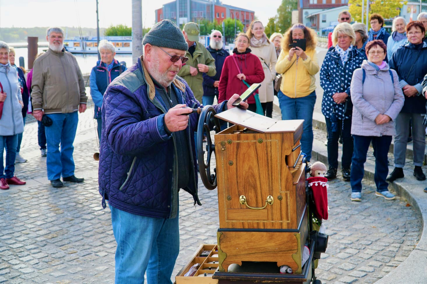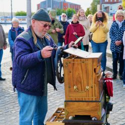 Am Alten Markt stellten die Stadtführer Musiker von einst wie Richard Wossidlo und Richard Müller vor. Am bekannten Seeadler am Weg zwischen Steinmole und Hafen warteten Musikschulchefin Ursula Linke und ein Trompeter auf die Teilnehmer. Am Stadthafen gab’s dann zum einen Musik vom Leierkastenspieler Perleberg, aber auch andere Töne, die Waren ausmachen. Wie das Rauschen der Müritzwellen, die Sirenen der Feuerwehr und die Signale der Schiffe der Blau-Weissen-Flotte. Auch das gehört zudem, was Einheimischen und Urlauber in der Müritzstadt regelmäßig zu Ohren kommt.