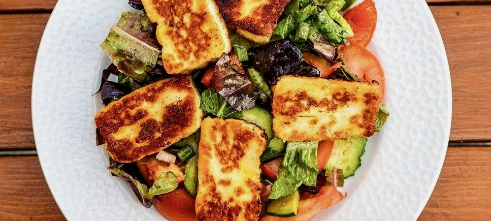 Grillkäse wie Halloumi unterscheidet sich von anderen Käsesorten durch einen höheren Schmelzpunkt. Er kann direkt auf den Grillrost gelegt werden, da er beim Heißwerden nur im Inneren weich wird.
