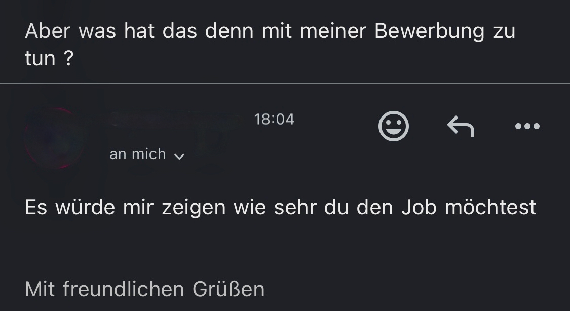 Auf die Erwiderung der jungen Frau: „Aber was hat das denn mit meiner Bewerbung zu tun?“ antwortete der Verantwortliche nun schon mit der vertrauten „Du“-Ansprache: „Es würde mir zeigen, wie sehr du den Job möchtest.“