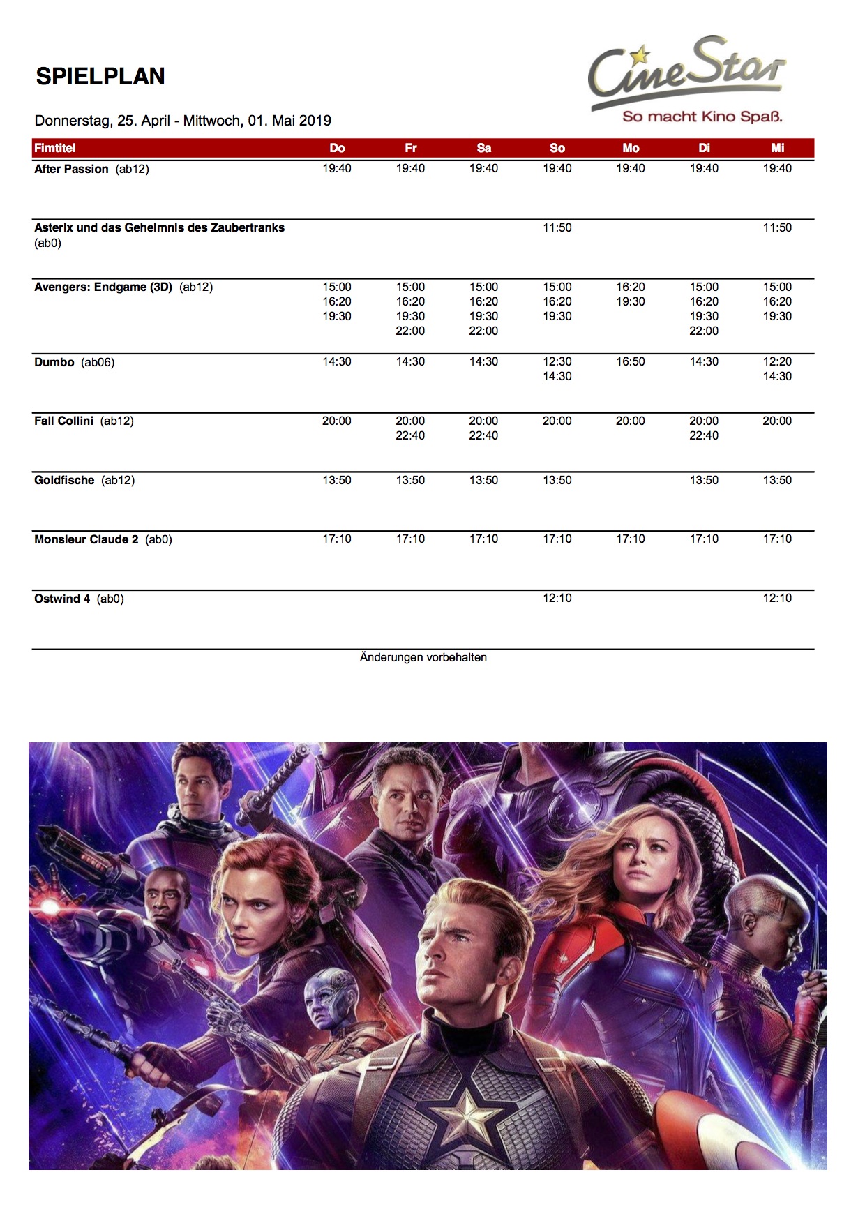 Das aktuelle Kinoprogramm des CineStar Waren mit dem Neustart: „Avengers Endgame“ 3D