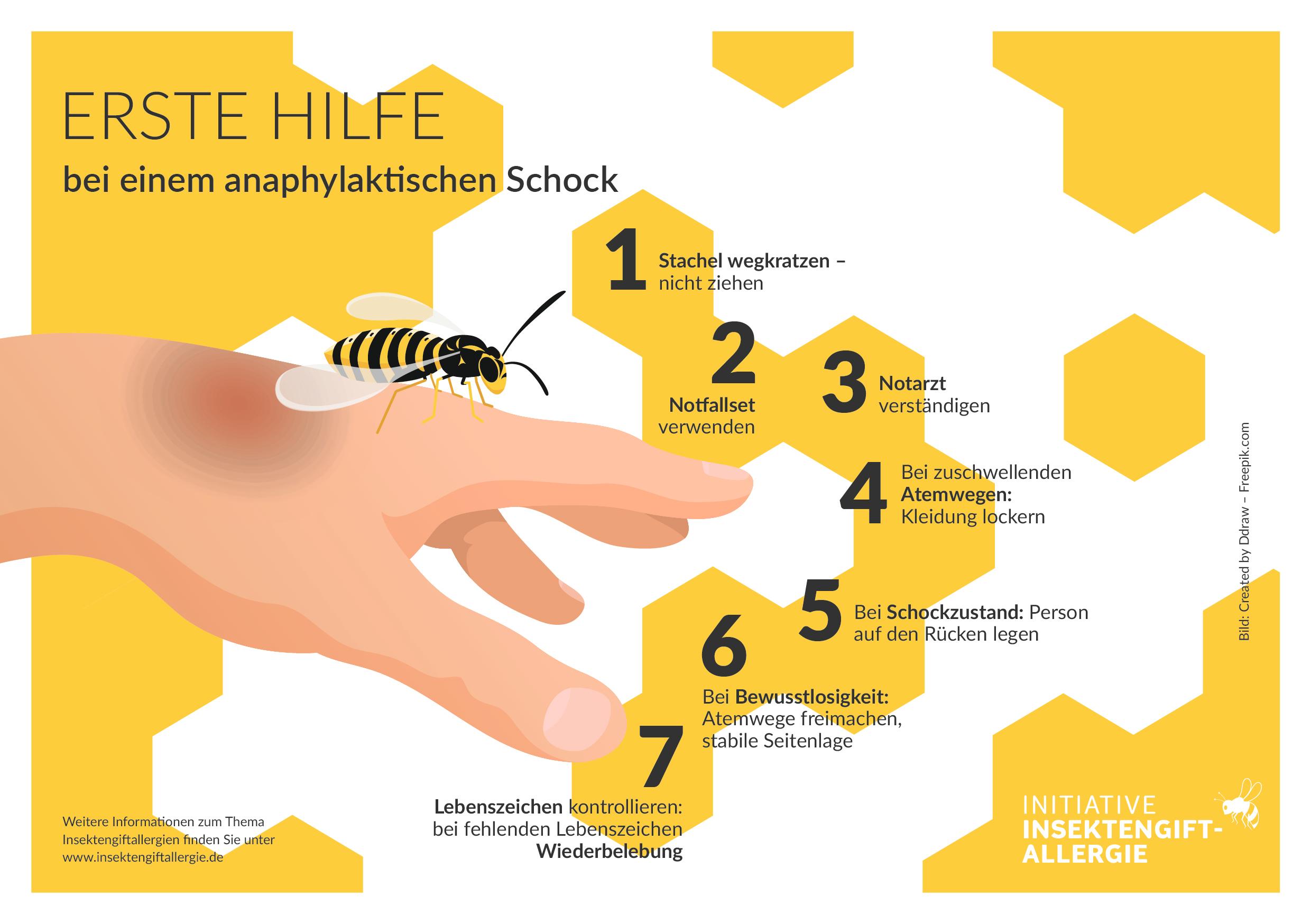 Ist die Reaktion auf das Insektengift so heftig, dass der Allergiker bewusstlos wird, machen Erste-Hilfe-Leistende zunächst die Atemwege frei und bringen den Patienten daraufhin in die stabile Seitenlage. Nicht vergessen: Den Kopf nach hinten überstrecken, damit der Rachenraum frei bleibt. Außerdem sollten ständig die Lebenszeichen des Betroffenen kontrolliert werden. Bei fehlenden Lebenszeichen sollten direkt Wiederbelebungsmaßnahmen eingeleitet werden.