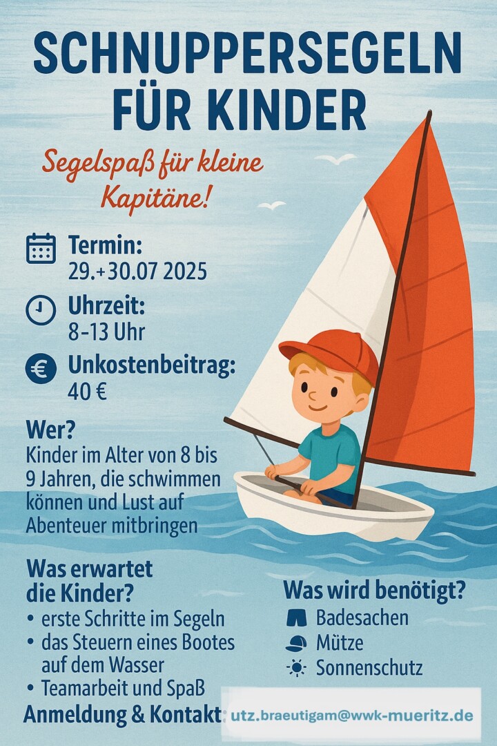 Das Schnuppersegeln findet am 29. und 30. Juli von 8-13 Uhr auf dem Vereinsgelände am Kameruner Bootshafen statt. Teilnehmen können alle interessierten Kinder – Vorkenntnisse sind nicht erforderlich. Ein erfahrenes Trainerteam sorgt für eine sichere und spannende Einführung ins Segeln.