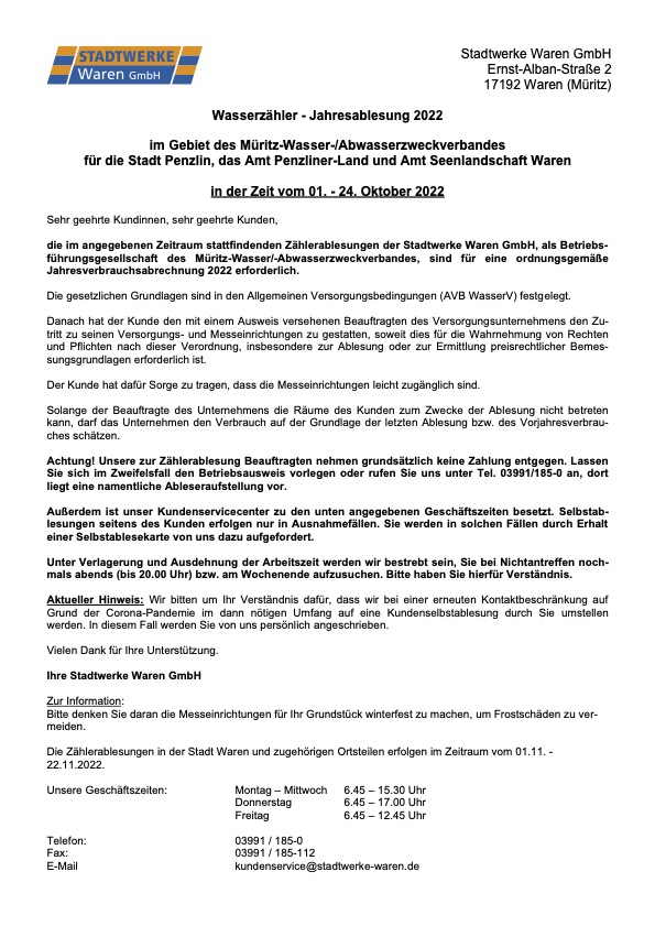 Ab morgen sind die Ableser der Stadtwerke Waren GmbH wieder unterwegs, um die Stände der Wasserzähler abzulesen. Und zwar im Gebiet des Müritz/Wasser-/Abwasserzweckverbandes für die Stadt Penzlin, das Amt Penzliner Land und das Amt Seenlandschaft Waren.