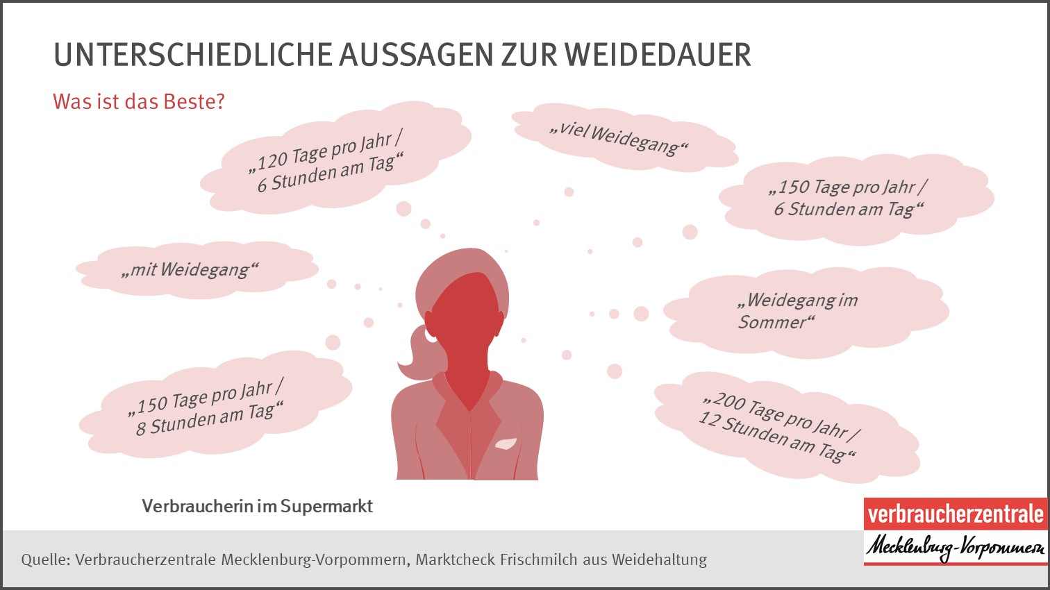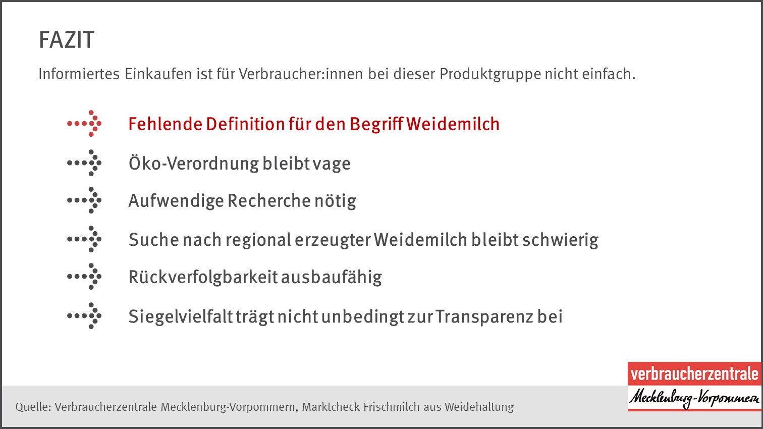 Die Herkunft der Milch ist für Verbraucher kaum nachzuvollziehen. Der Einkauf regionaler Milch wird dadurch erschwert. Von einer „lückenlosen Rückverfolgbarkeit“ ist die Weidemilch noch weit entfernt. Die Verbraucherzentrale Mecklenburg-Vorpommern untersuchte im Februar/März 2022 eine Stichprobe von 23 Frischmilch-Produkten, die eine Angabe zu Weide(-haltung), besonderer Fütterung (zum Beispiel „Heumilch“) oder Tierwohl auf der Verpackung trugen.