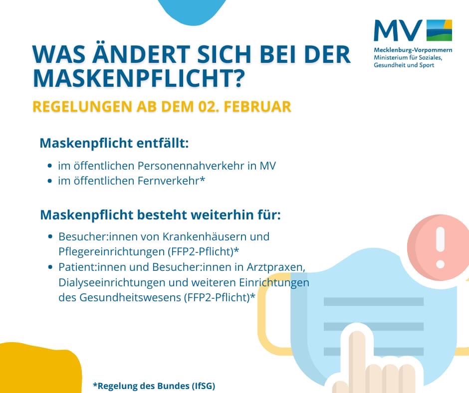 Am morgigen 2. Februar tritt die neue Corona Landesverordnung in Kraft. Wesentlicher Bestandteil ist die Aufhebung der Maskenpflicht im öffentlichen Personennahverkehr in Mecklenburg-Vorpommern. Gesundheitsministerin Stefanie Drese begrüßte, dass gleichzeitig auch der Bund die Maskenpflicht im Fernverkehr aufhebt: „Für die Fahrgäste sind die einheitlichen Regelungen nun deutlicher nachvollziehbarer.“