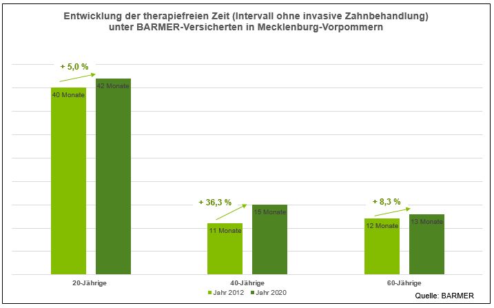 Den Analysen im BARMER Zahnreport zufolge kommen 20-Jährige in Mecklenburg-Vorpommern im Schnitt rund dreieinhalb Jahre ohne Eingriffe durch den Zahnarzt aus. Im Vergleich der Jahre 2012 und 2020 ist dieser Zeitraum sogar noch um zwei Monate angewachsen. Einen noch deutlicheren Anstieg der therapiefreien Zeit zeigen die Daten bei 40-Jährigen in Mecklenburg-Vorpommern. Diese kamen im Jahr 2012 durchschnittlich etwas mehr als 11 Monate ohne invasive Zahntherapie aus. Im Jahr 2020 betrug die therapiefreie Dauer bereits über 15 Monate, ein Anstieg um über 36 Prozent. Auch bei Personen im Alter von 60 Jahren wachsen die Intervalle, in denen keine Eingriffe an den Zähnen notwendig sind. Durchschnittlich 12 Monate dauerten sie im Jahr 2012, im Jahr 2020 waren es 13 Monate. „Der Wandel hin zu einer nachhaltigen Zahnmedizin sollte konsequent weiterverfolgt werden, denn Prävention muss Vorrang vor Intervention haben“, sagt BARMER-Landeschef Kutzbach.