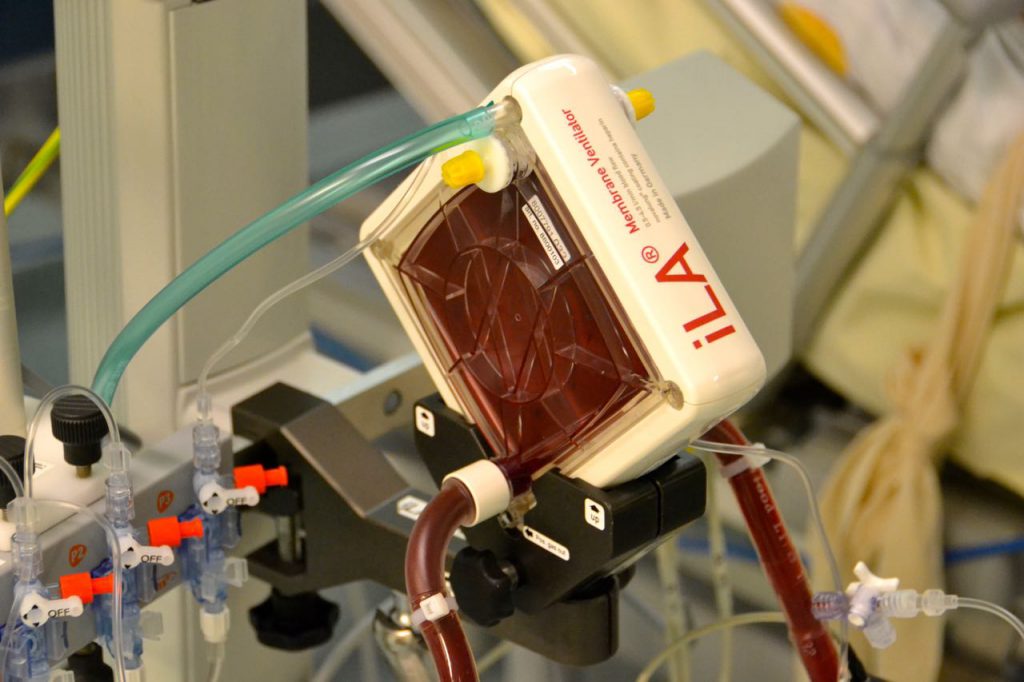 Der Intensivmediziner Dr. Bergt erläutert die Funktionsweise des Systems: „Der Gasaustausch erfolgt durch einen außerhalb des Körpers stattfindenden Kreislauf (extrakorporal). In den Blutkreislauf wird eine Membran eingeschaltet – sie bildet das zentrale Element des Systems. Diese Membran funktioniert wie eine Art Filter. Das Blut des Patienten fließt aus einer Vene im Lendenbereich hin zum Membranventilator. Dort wird das Kohlendioxid herausgefiltert und gleichzeitig werden die Fasern der Membran mit Sauerstoff umströmt und somit das Blut zusätzlich mit Sauerstoff angereichert. Anschließend fließt das Blut wieder in die Vene des Patienten zurück. Der Blutfluss im extrakorporalen Kreislauf wird durch eine Pumpe gewährleistet. Die Sauerstoffzufuhr erfolgt bei diesem Verfahren zum Großteil über die Lunge mittels einer zusätzlichen lungenschonenden künstlichen Beatmung.“