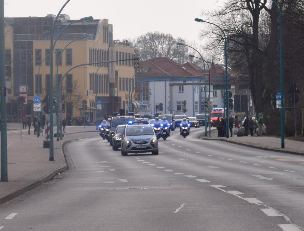 Insgesamt 35 Beamte der Polizeiinspektion Neubrandenburg waren im Einsatz, um die Fahrtstrecke vom Flughafen Trollenhagen über die L35, durch die Stadt Neubrandenburg, über die B104 und letztendlich L281 nach Oertzenhof freizuhalten.
