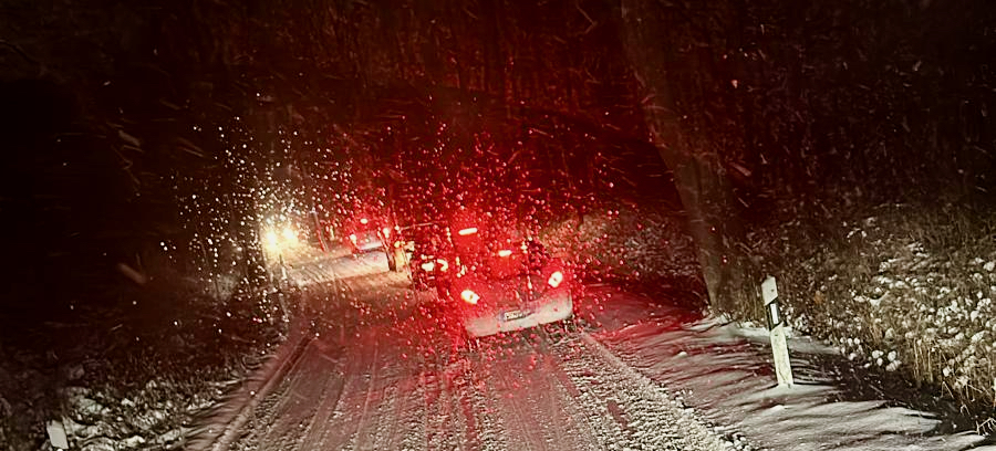 Heute am frühen Abend beispielsweise, der Schneefall hatte aufgehört, es sah eigentlich alles ganz gut aus. Doch im Scheinwerferlicht konnte man die spiegelglatte Gefahr erkennen.