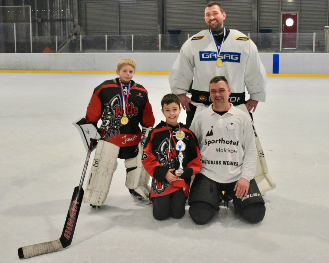 Foto unten: Generationsübergreifende Positionen beim Malchower Eishockey. Friedrich Meyer steht bereits im Tor der Junioren, sein Papa Ricco Meyer steht als Profi im Tor bei den Malchower Wölfen. (Hinten) Gino Kühn eifert seinem Papa Robin ebenfalls nach. Robin spielt bei den Malchower Wölfen und Gino im Nachwuchs der Wölfe Junioren.