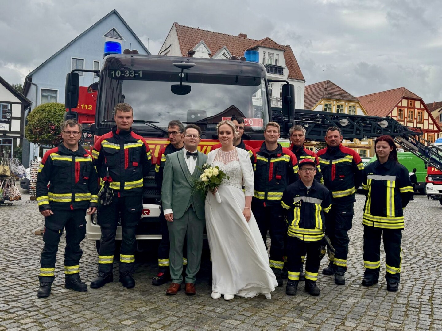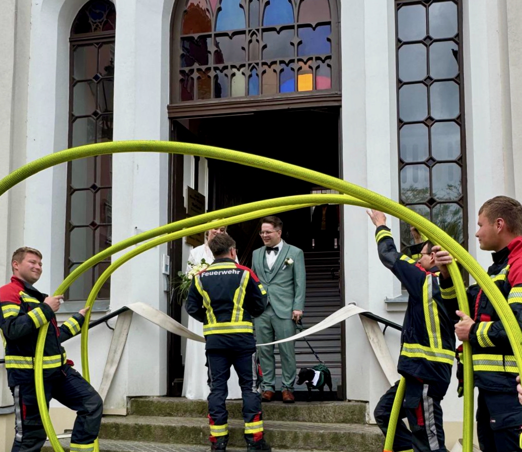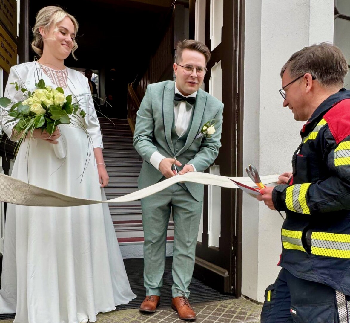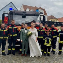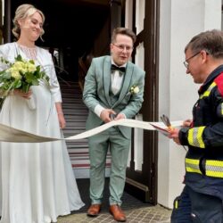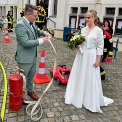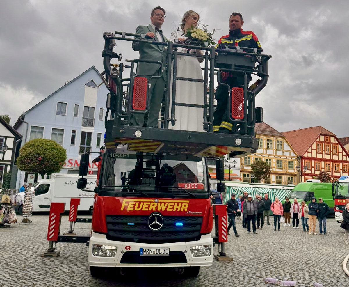 Solche Einsätze hätten Warens Feuerwehrleute sicherlich gerne öfter: Uwe Hanisch, 27, und Anna Paulke, 23, haben sich heute im Warener Standesamt das Ja-Wort gegeben und wurden anschließend von den Kameraden überrascht. Denn Beide sind aktive Mitglieder der Einsatztruppe und haben sich übrigens auch bei ihrem ehrenamtlichen Engagement in der Feuerwehr kennengelernt. Klar, dass sich ihre Feuerwehrkollegen einige Prüfungen einfallen lassen haben, die Uwe und Anna als gestandene Retter vor dem Rathaus aber mit Bravour meisterten. Die Kameraden um Wehrführer Reimond Kamrath gratulieren ganz herzlich und wünschen dem Paar viel Glück in ihrer gemeinsamen Zukunft. „Wir sind Müritzer“ schließt sich diesen Glückwünschen an.