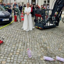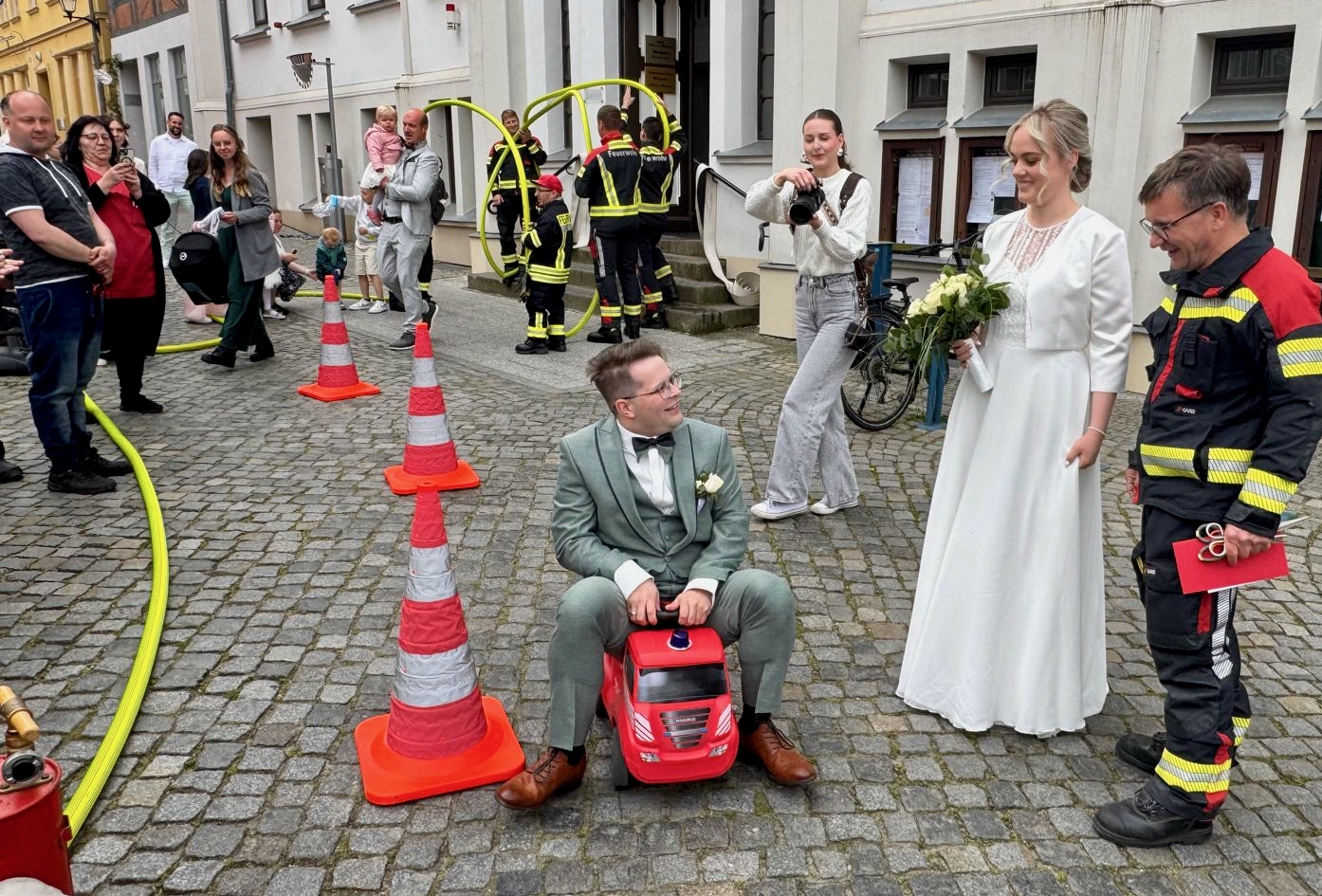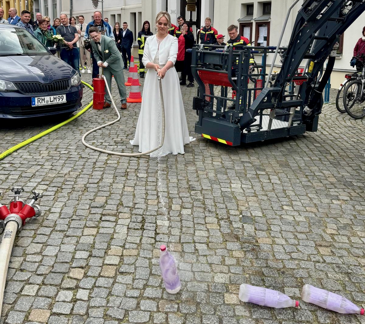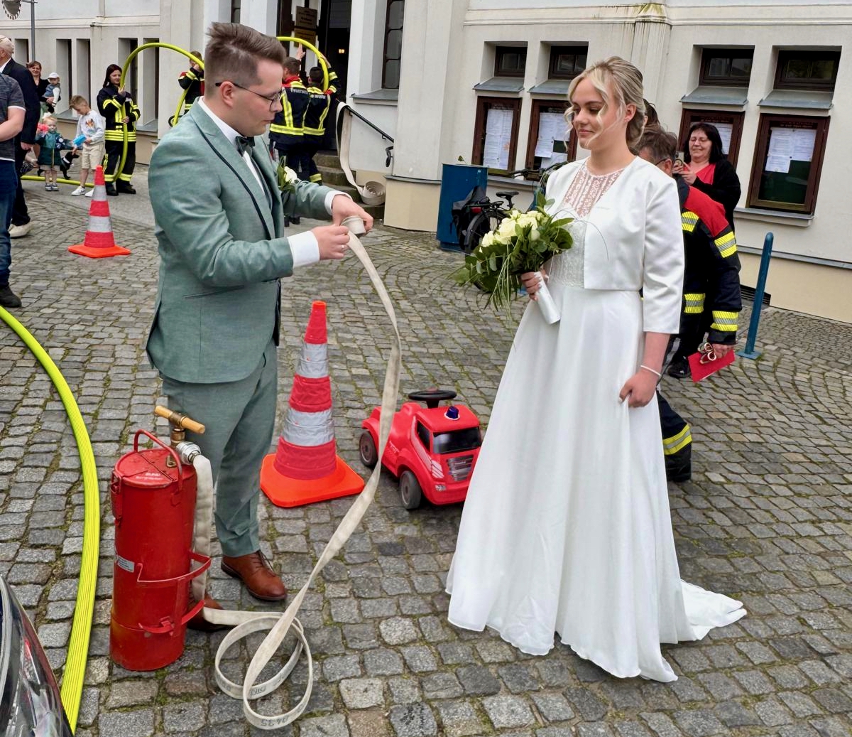 Solche Einsätze hätten Warens Feuerwehrleute sicherlich gerne öfter: Uwe Hanisch, 27, und Anna Paulke, 23, haben sich heute im Warener Standesamt das Ja-Wort gegeben und wurden anschließend von den Kameraden überrascht. Denn Beide sind aktive Mitglieder der Einsatztruppe und haben sich übrigens auch bei ihrem ehrenamtlichen Engagement in der Feuerwehr kennengelernt. Klar, dass sich ihre Feuerwehrkollegen einige Prüfungen einfallen lassen haben, die Uwe und Anna als gestandene Retter vor dem Rathaus aber mit Bravour meisterten. Die Kameraden um Wehrführer Reimond Kamrath gratulieren ganz herzlich und wünschen dem Paar viel Glück in ihrer gemeinsamen Zukunft. „Wir sind Müritzer“ schließt sich diesen Glückwünschen an.