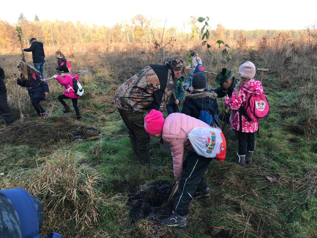 Währenddessen hatten die Erstklässler alle Hände voll zu tun, denn sie pflanzten die Flatterulme, den Baum des Jahres, in vorbereitete Pflanzlöcher.