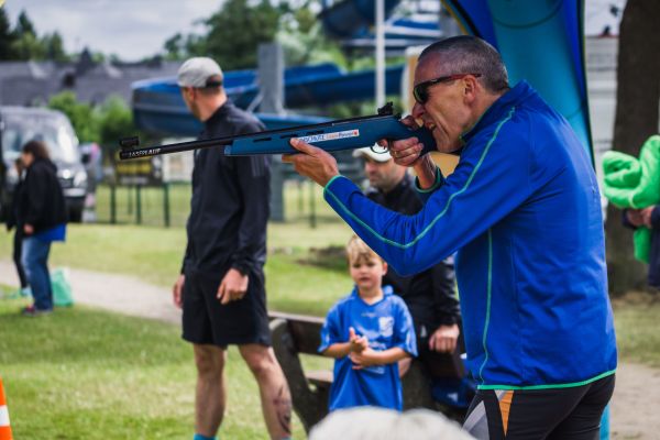Beim Sommerbiathlon heißt es – Laufen und Schießen. Gelaufen werden je Teilnehmer insgesamt zwei Runden um das Volksbad. Dabei schießt jeder Läufer zweimal, – einmal liegend und einmal stehend.