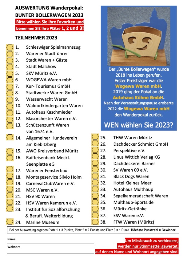 In diesem Jahr dürfen die Zuschauer drei Plätze vergeben. Die Stimmzettel werden an der Bühne verteilt, können aber auch hier bei „Wir sind Müritzer“ ausgedruckt werden. Abgabeschluss ist dann um 14 Uhr an der Bühne. Also: Stift nicht vergessen und abstimmen!