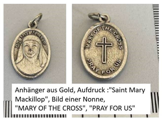 - Anhänger aus Gold, Aufdruck Vorderseite: „Saint Mary Mackillop“, Bild einer Nonne, Rückseite: „MARY OF THE CROSS“, „PRAY FOR US“