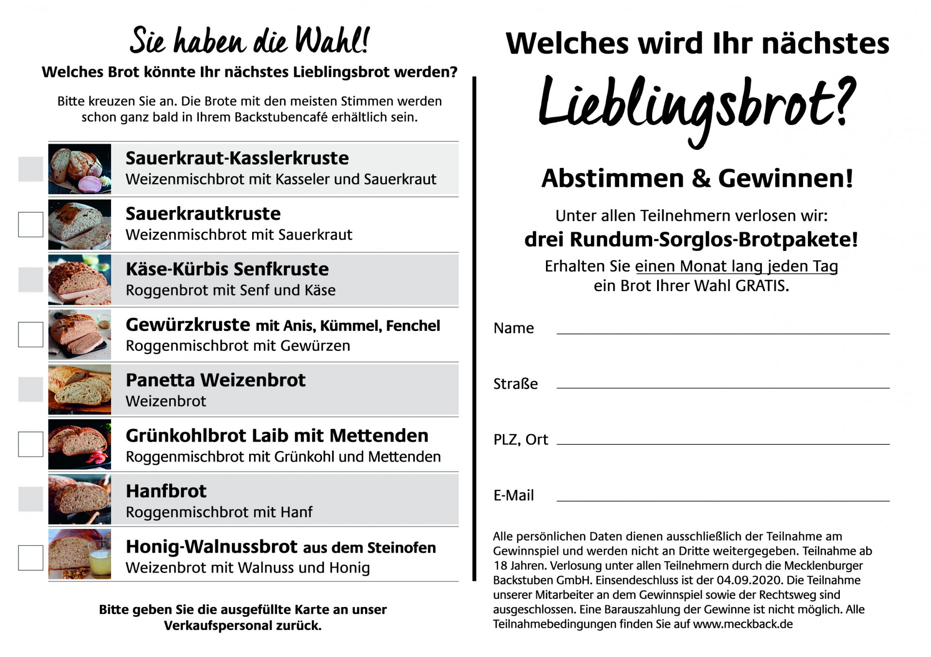 Seit einigen Tagen liegen in allen Filialen des Familienunternehmens Teilnahme-Karten aus, auf denen die acht Brotsorten und eine kurze Beschreibung stehen. Die Kunden können dort die Brotsorten ankreuzen, die sie gerne im Oktober kaufen möchten.