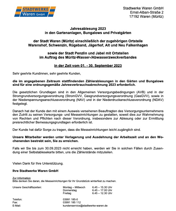 Ab 1. September sind die Ableser der Warener Stadtwerke wieder unterwegs, und zwar, um die Zählerstände in den Gartenanlagen und Bungalows abzulesen. Die Mitarbeiter des Unternehmens lesen in Waren einschließlich der Ortsteile Warenshof, Schwenzin, Rügeband, Jägerhof, Alt und Neu Falkenhagen sowie in der Stadt Penzlin und in Jabel mit Ortsteilen ab.