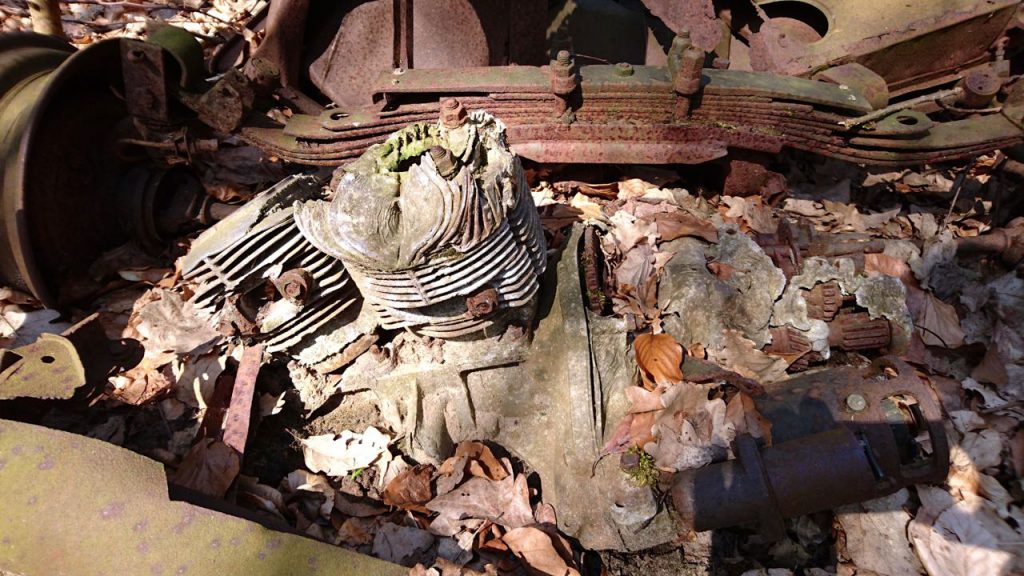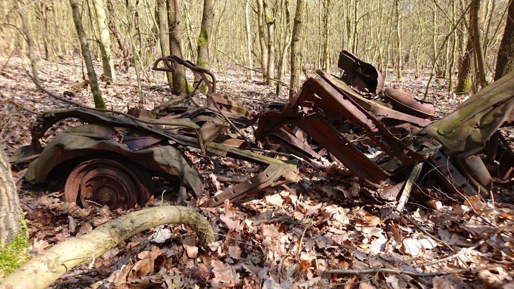 Nach dem Verbrennungsmotor zu urteilen, könnte es sogar ein Trabi-Kübel gewesen sein. Seine rostigen Reste wurden etwa 400 Meter abseits des Radwegs vom Zeltplatz Kamerun nach Eldenburg gesichtet. Die Abzweigung führt zum Eldenburger Kanal und wird oft von Leuten genutzt, die von der Einmündung des Kanals zur Müritz auf das Wasser und auch Waren blicken wollen.
