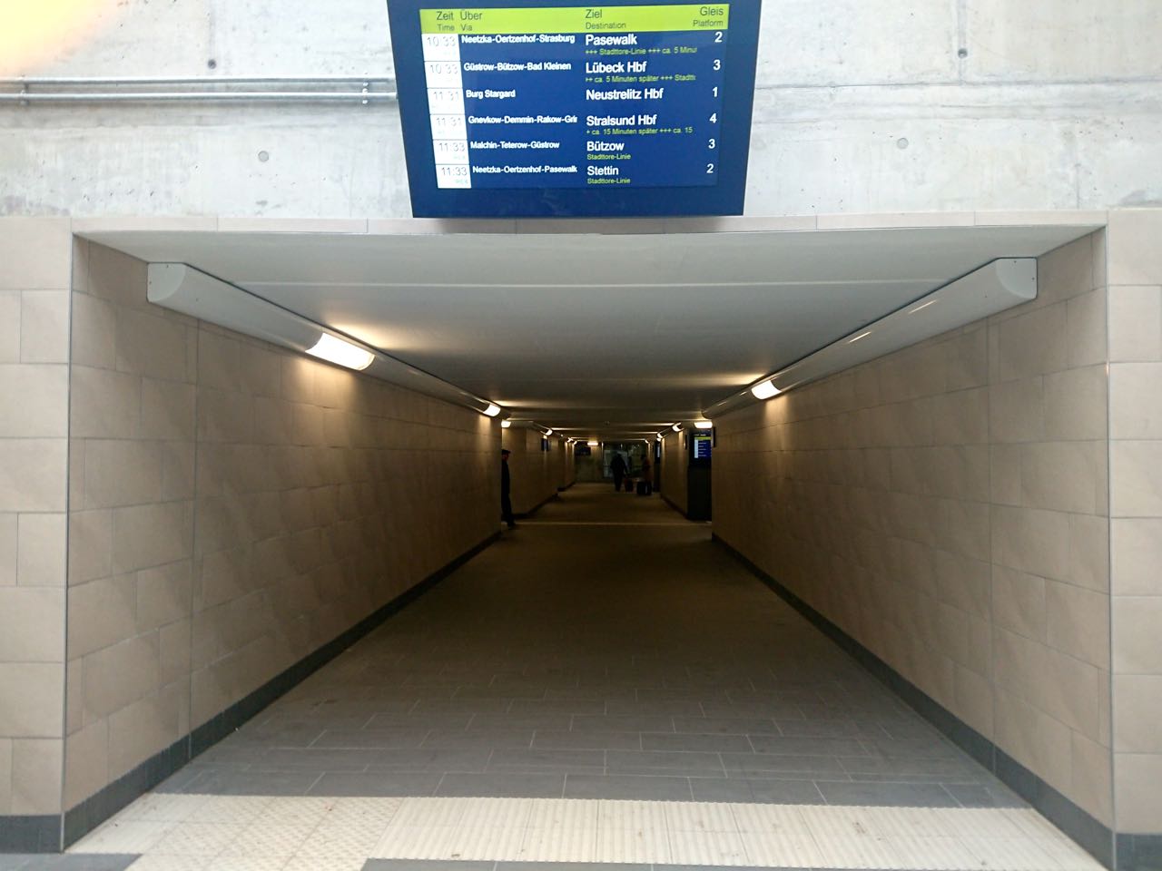 Und neben der Fußgängerbrücke hat Neubrandenburg nun auch einen Tunnel, der die Altstadt mit den nördlichen Stadtteilen Vogelviertel und Reitbahnweg verbindet. Graue Steinwände mit Beleuchtung vermitteln ein freundliches Design, allerdings finden sich auch schon die ersten Schmierereien.