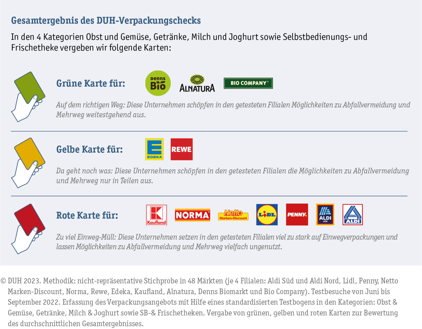 Um zu dieser Einschätzung zu kommen, wurden in 48 Testbesuchen (je 4 Märkte pro Kette) in Nord-, Ost- und Süddeutschland, von Juni bis September 2022 das Angebot und die Verpackungen überprüft, welche Märkte Maßnahmen zur Verpackungsvermeidung umsetzen, etwa durch den Verkauf von unverpackten Obst und Gemüse oder den Einsatz von Mehrwegverpackungen.