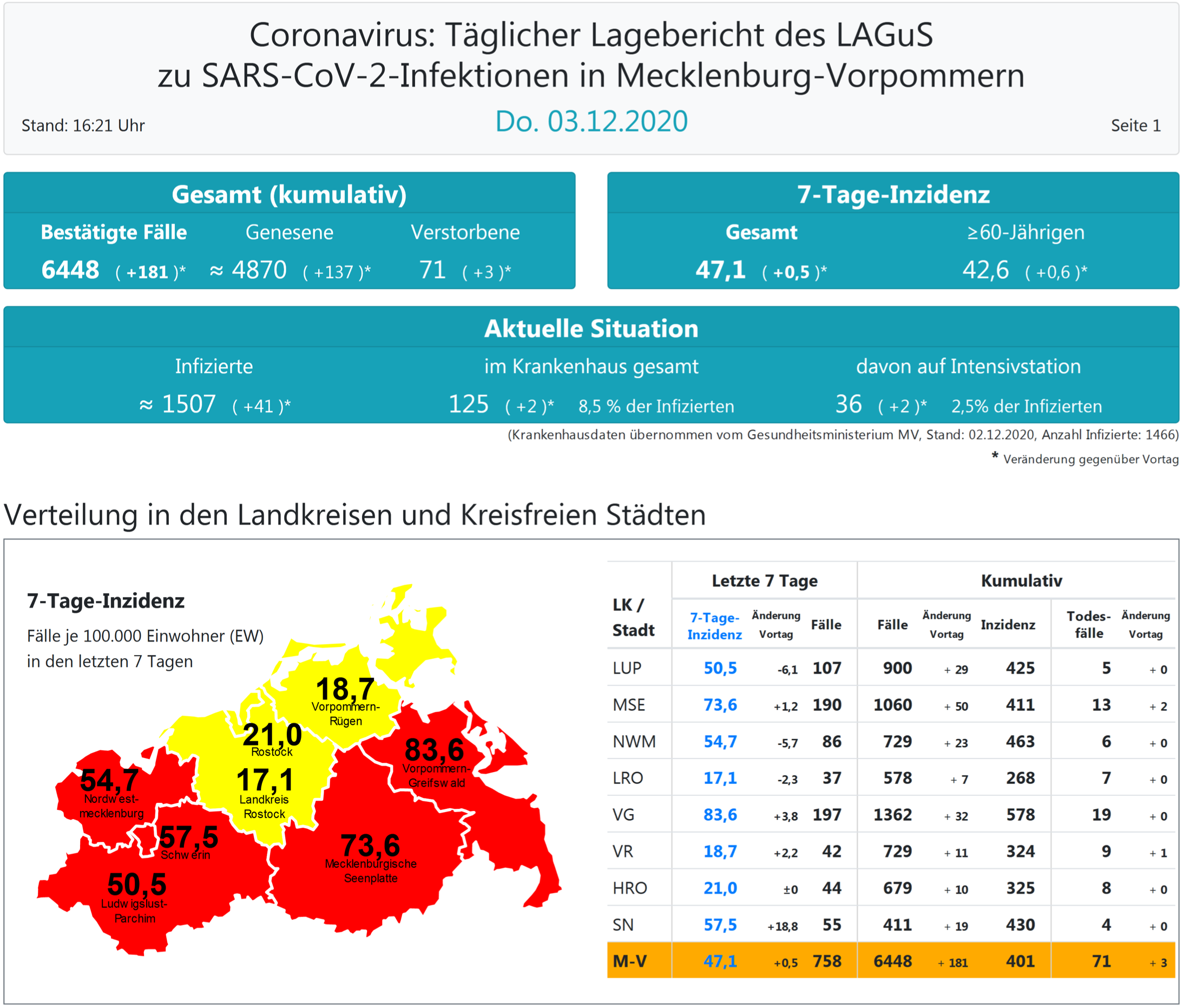 Insgesamt wurden in MV bisher 6448 Infektionen festgestellt. Laut einer Schätzung des Robert Koch-Instituts (RKI) sind in Mecklenburg-Vorpommern 4870 der positiv getesteten Menschen von einer Covid-19-Erkrankung genesen. Insgesamt gab es bislang 71 Todesfälle im Land, drei mehr als gestern.