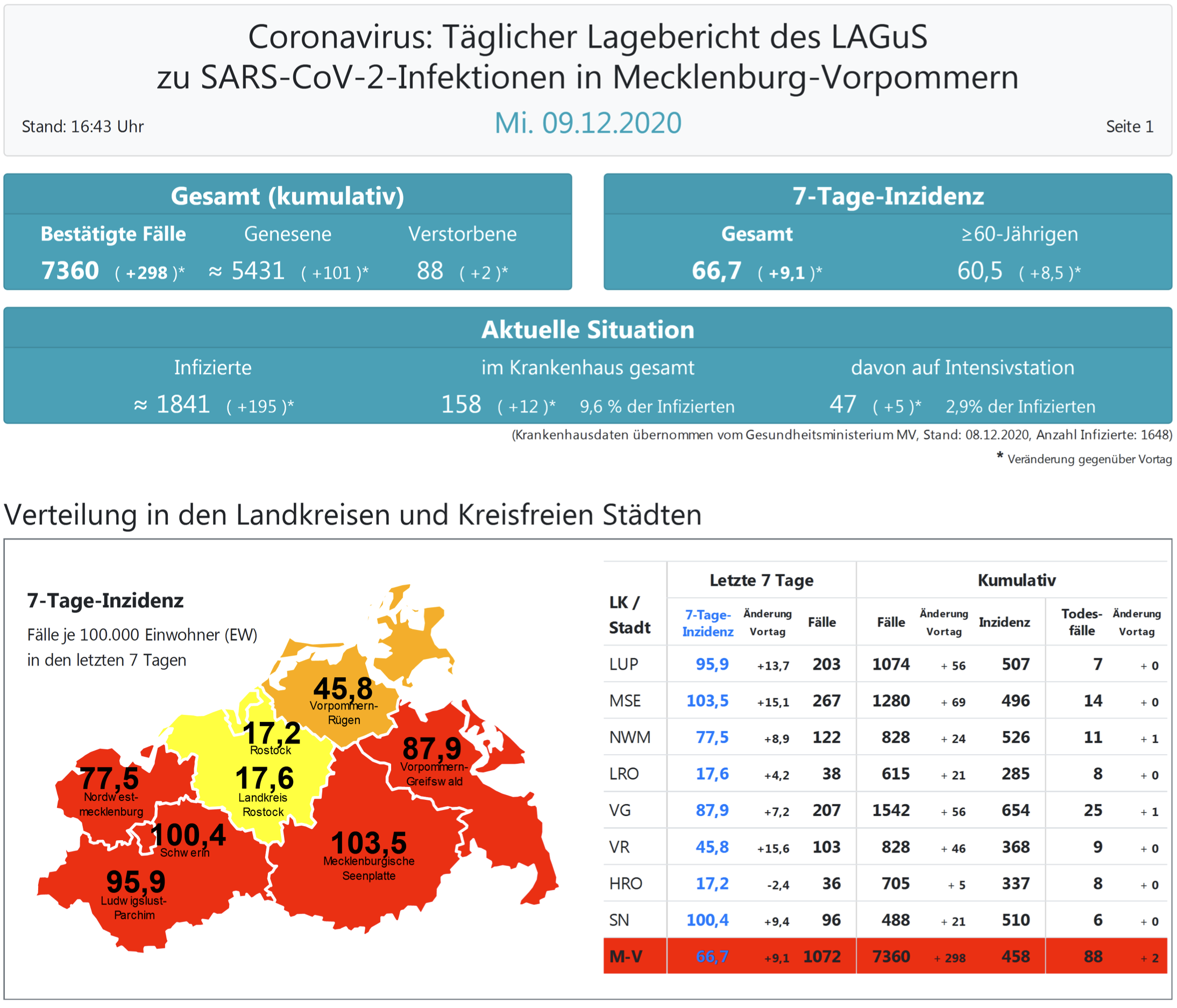 Insgesamt wurden in MV bisher 7360 Infektionen festgestellt. Im Land gab es bislang 88 Todesfälle, zwei mehr als gestern.
