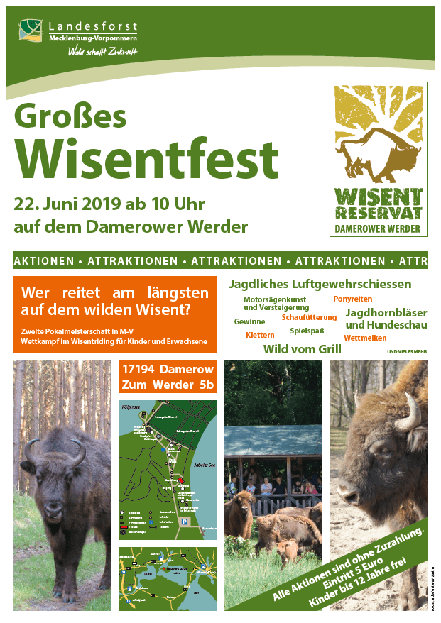 Auch am bevorstehenden Wochenende ist in der Müritz-Region wieder richtig viel los. Unter anderem beginnt am morgigen Sonnabend um 10 Uhr in Damerow das große Wisentfest mit Unterhaltung für die ganze Familie – Wisentriding, Jagdliches Luftgewehrschießen, Motorsägenkunst, Schaufütterung, Jagdhornbläser mit Jagdhundeschau, Gewinne, Spielspaß u.v.m.