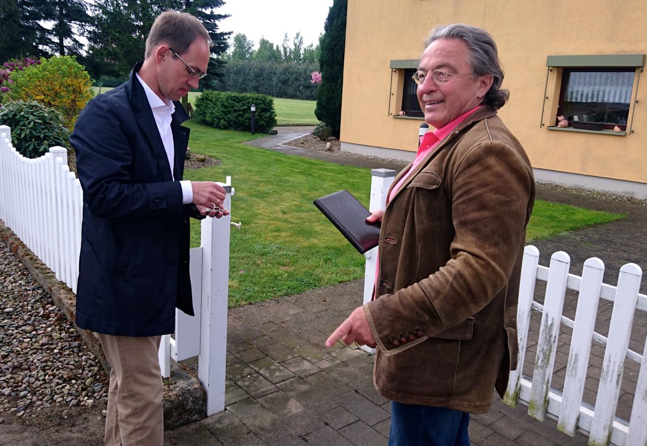 Tatsächlich kam Krause auch nicht selbst zur Übergabe am Montag, sondern sein Rechtsvertreter: Peter-Michael Diestel, der ja nicht weit weg in Zislow wohnt. Nach kurzer Begrüßung übergab Diestel dem Anwalt der Unternehmerfamilie Szustak – Arne Trimpop die Schlüssel, danach gingen beide ins Haus, um den Zustand zu kontrollieren und Absprachen zu treffen. Nach einer ersten Prüfung versicherte Trimpop, dass das Haus in einem ordnungsgemäßen Zustand sei und auch die Inneneinrichtung.