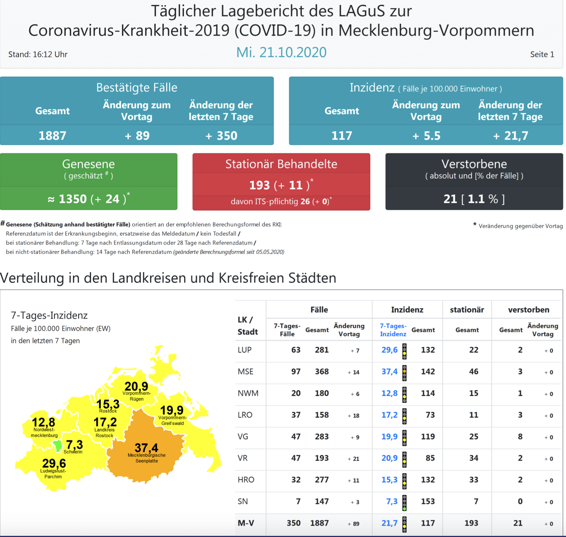 Laut einer Schätzung des Robert Koch-Instituts (RKI) sind in Mecklenburg-Vorpommern 1350 der positiv getesteten Menschen von einer Covid-19-Erkrankung genesen. Insgesamt gab es bislang 21 Todesfälle im Land.