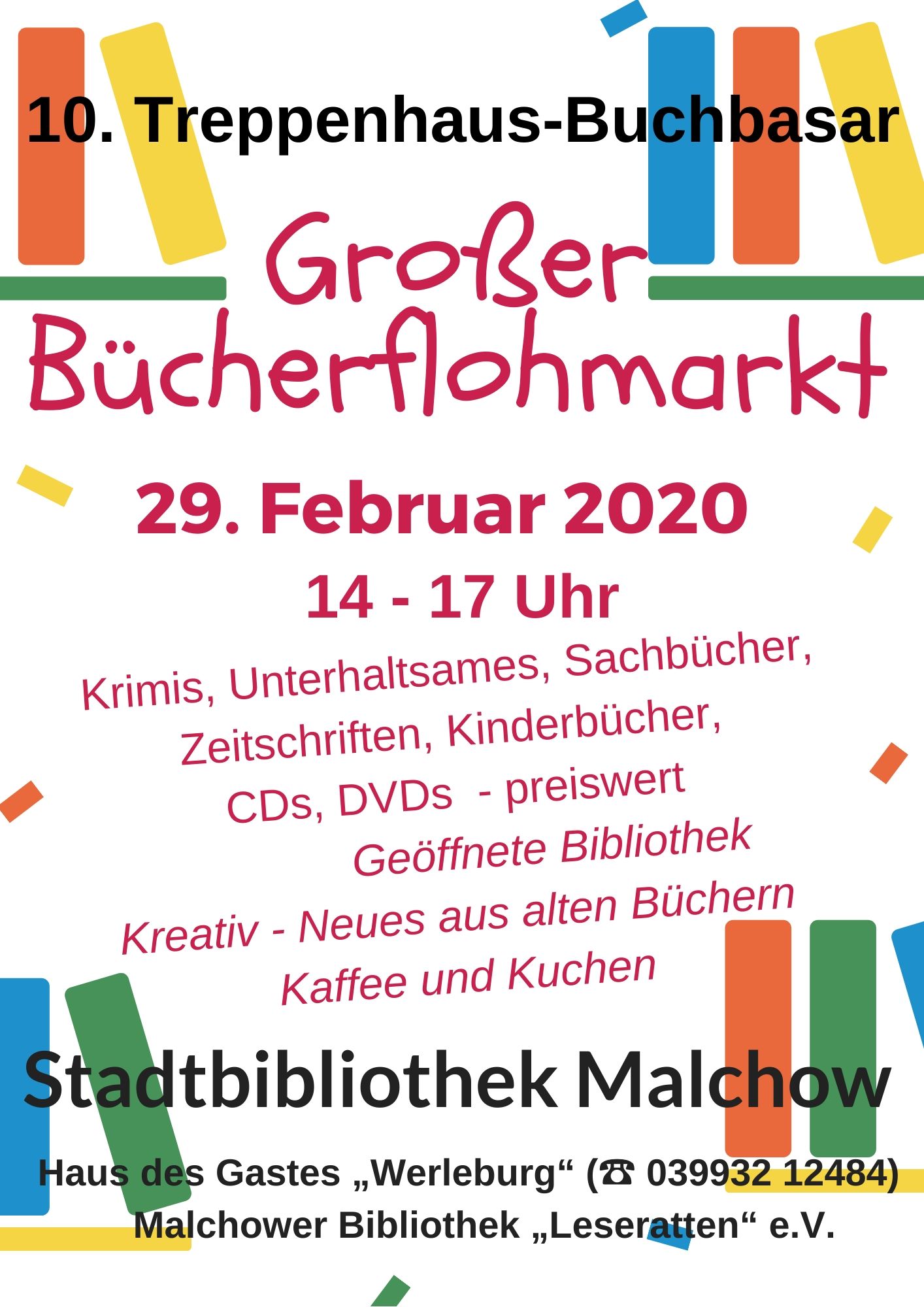 Zum 10. Mal heißt es am morgigen Sonnabend, 29. Februar, wieder „Treppenflohmarkt in Malchow“. Verkauft werden in der Stadtbibliothek in der „Werleburg“ von 14 bis 17 Uhr Bücher, CDs und DVDs. Dabei sind Krimis, Kitschromane, Kochbücher, Unterhaltsames, auch Sachbücher und Kinderbücher.