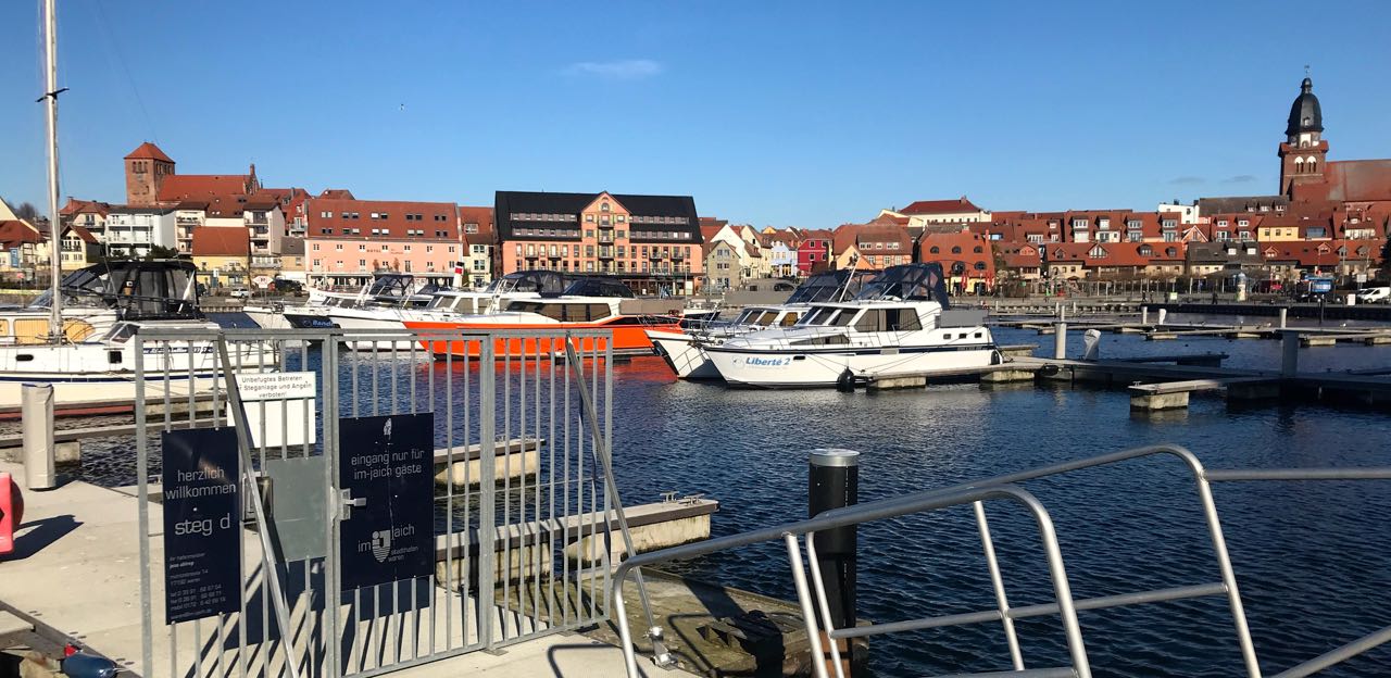 Warens Hafen heute Mittag – zwar ein bisschen frisch, aber strahlend blauer Himmel. Und das soll auch morgen und am Sonntag so bleiben.