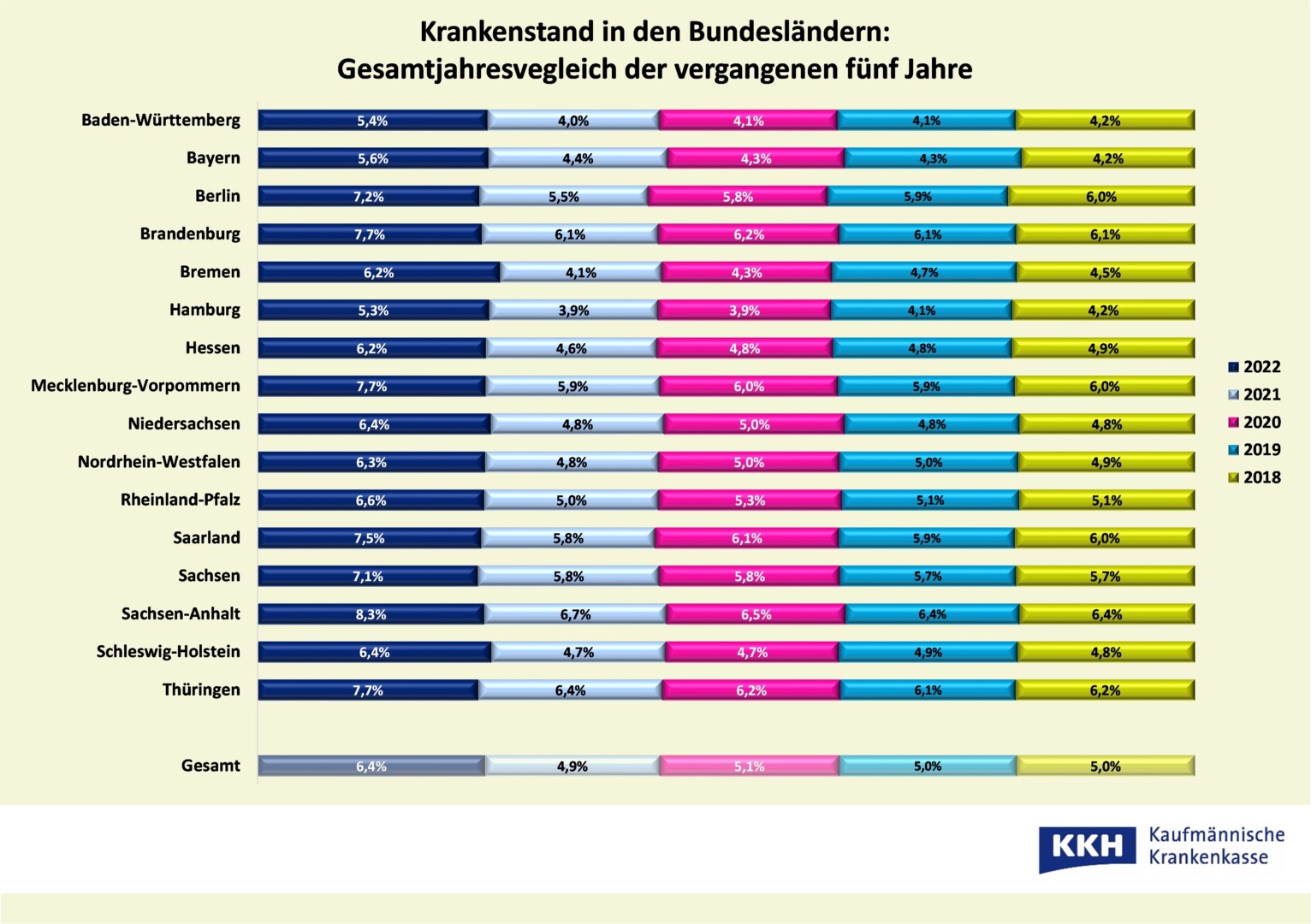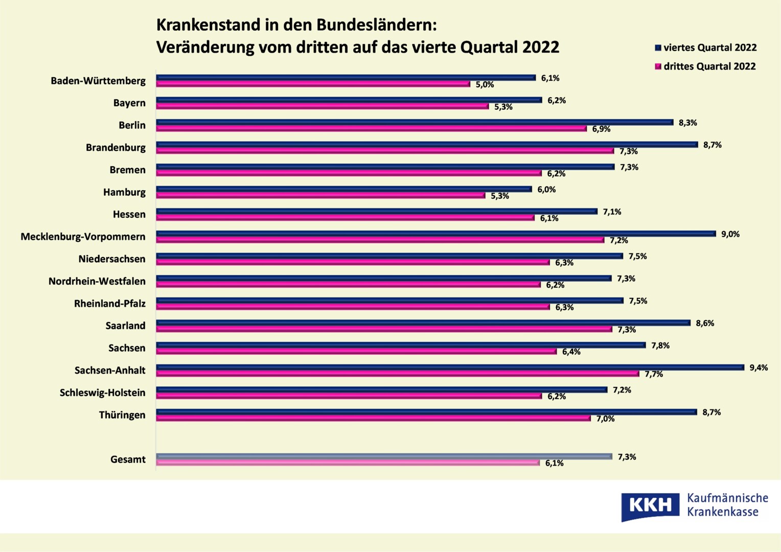 Den höchsten Krankenstand für 2022 registriert die KKH mit 8,3 Prozent in Sachsen-Anhalt, den niedrigsten mit 5,3 Prozent in Hamburg.