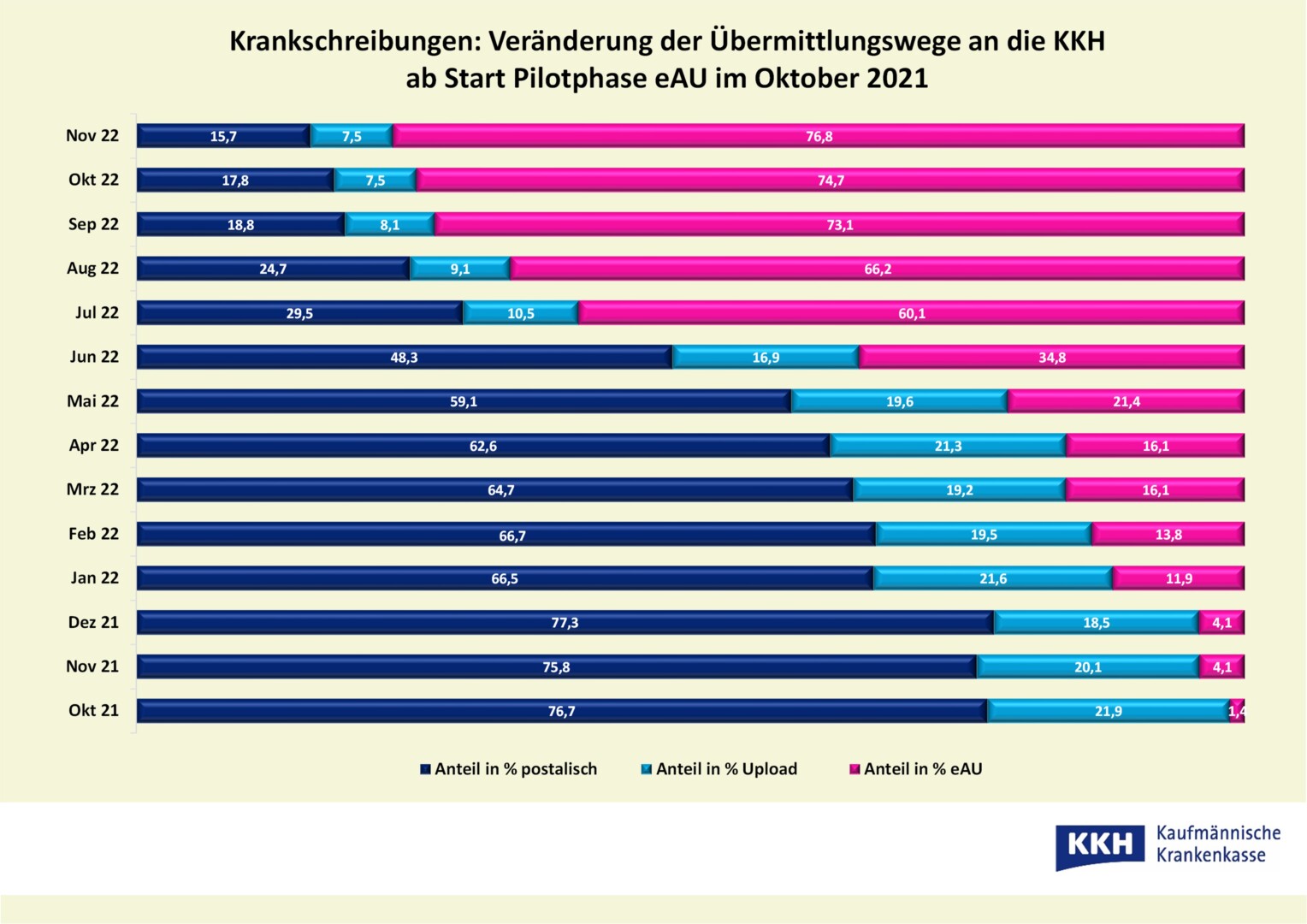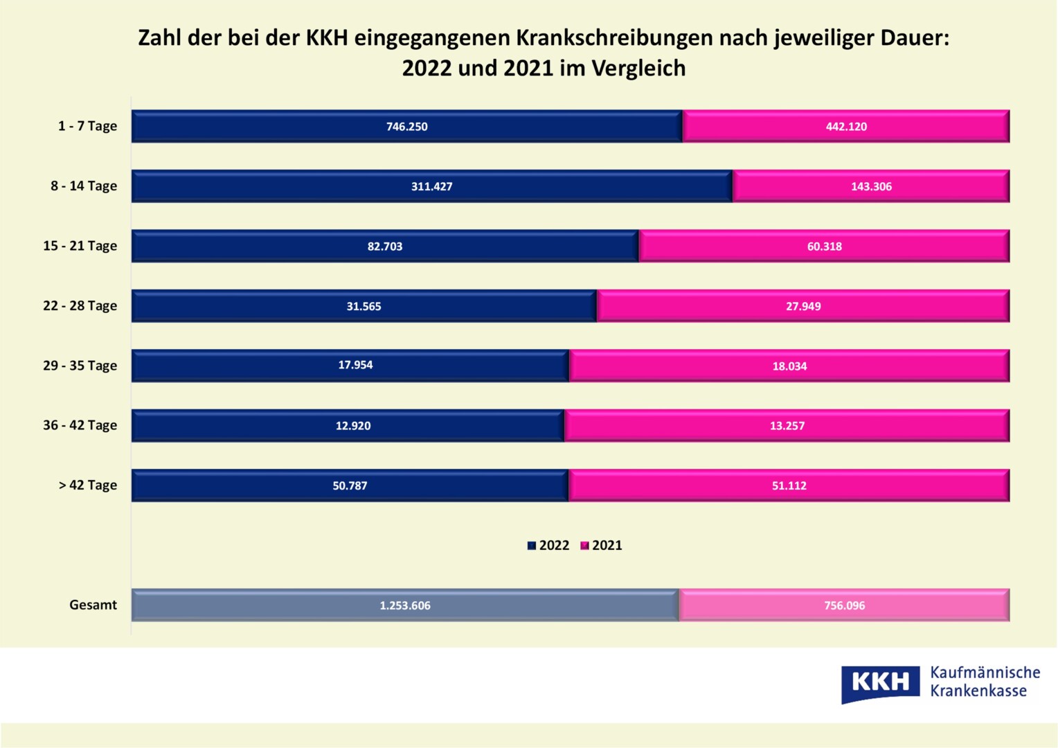 KKH-Daten stützen diese These: Im vergangenen Jahr ist die Zahl der eingereichten Kurzzeit-Krankschreibungen enorm gestiegen. So registriert die KKH für das Jahr 2021 noch rund 442.000 Atteste von einer Dauer bis zu sieben Tagen, im Jahr 2022 waren es bereits rund 746.000. Ab einer Krankheitsdauer von 15 Tagen nimmt dieser Effekt spürbar ab. Darüber hinaus werden mittlerweile mehr als 75 Prozent aller Krankmeldungen von den Arztpraxen direkt elektronisch an die KKH übermittelt, ohne Umweg über den Versicherten. Im Juni 2022 waren es hingegen noch rund 35 Prozent, im Dezember 2021 gerade einmal vier Prozent.
