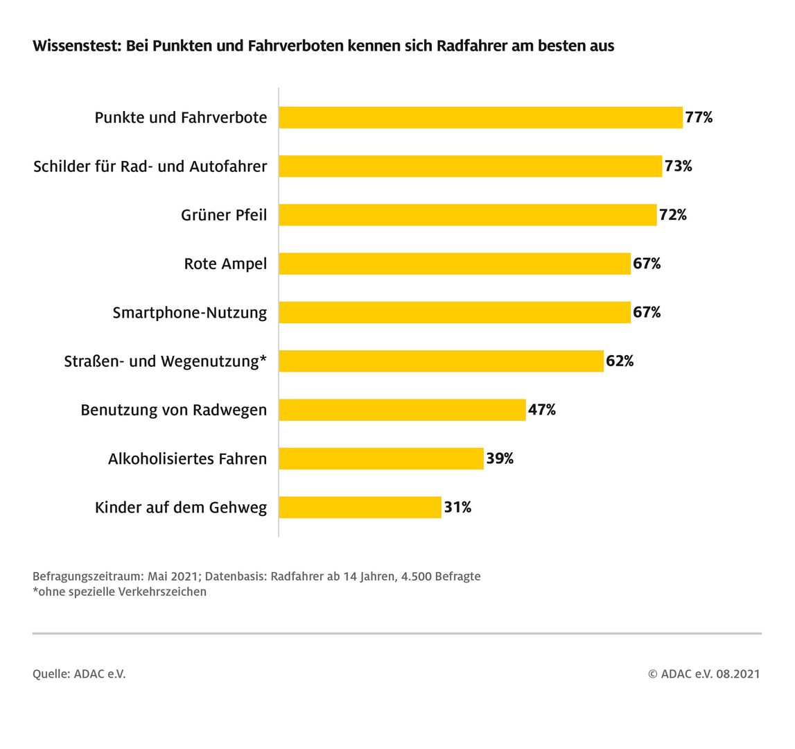 So wussten nur 18 Prozent, dass radfahrende Kinder bis acht Jahre den Gehweg nutzen müssen. Lediglich 15 Prozent konnten sagen, dass dies bis zum Alter von zehn Jahren erlaubt ist, solange es weder einen baulich angelegten Radweg noch einen Seitenstreifen gibt. Nur ein Viertel der Befragten kannte außerdem die Benutzungspflicht, sobald ein blaues Radwegschild aufgestellt ist. Auch war mehr als ein Drittel fälschlicherweise davon überzeugt, dass Fahren gegen die Einbahnstraße erlaubt ist. 40 Prozent war nicht bewusst, dass der Gesetzgeber Alkohol im Sattel ab 1,6 Promille als Straftat einstuft, diese mit Punkten und Geldstrafe ahndet und zudem der Verlust der Fahrerlaubnis droht.